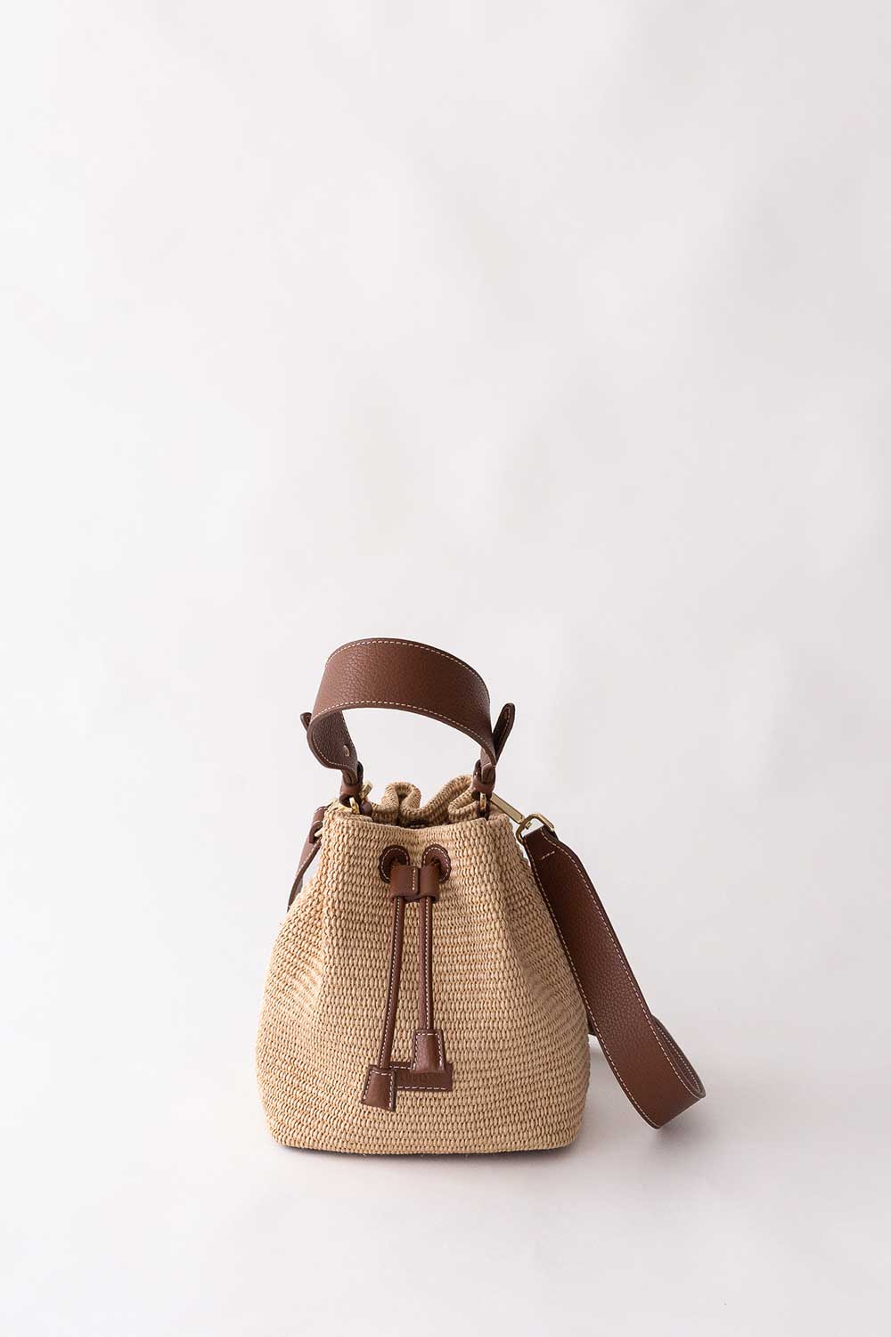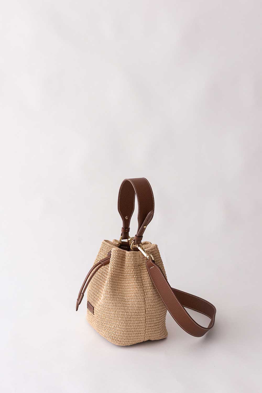 The Bon Voyage bucket bag is made with soft Rafia and leather panels.