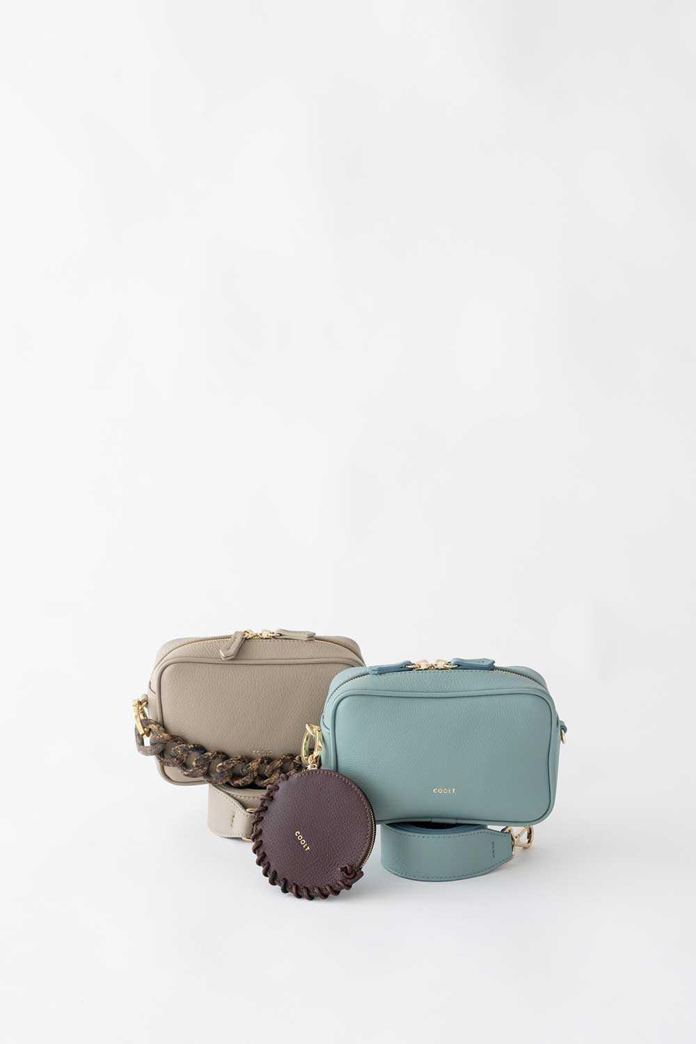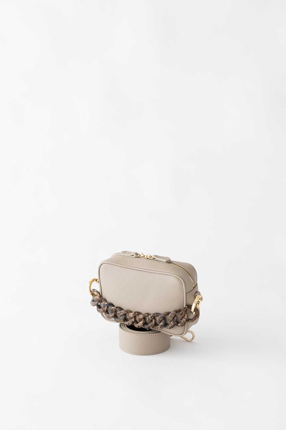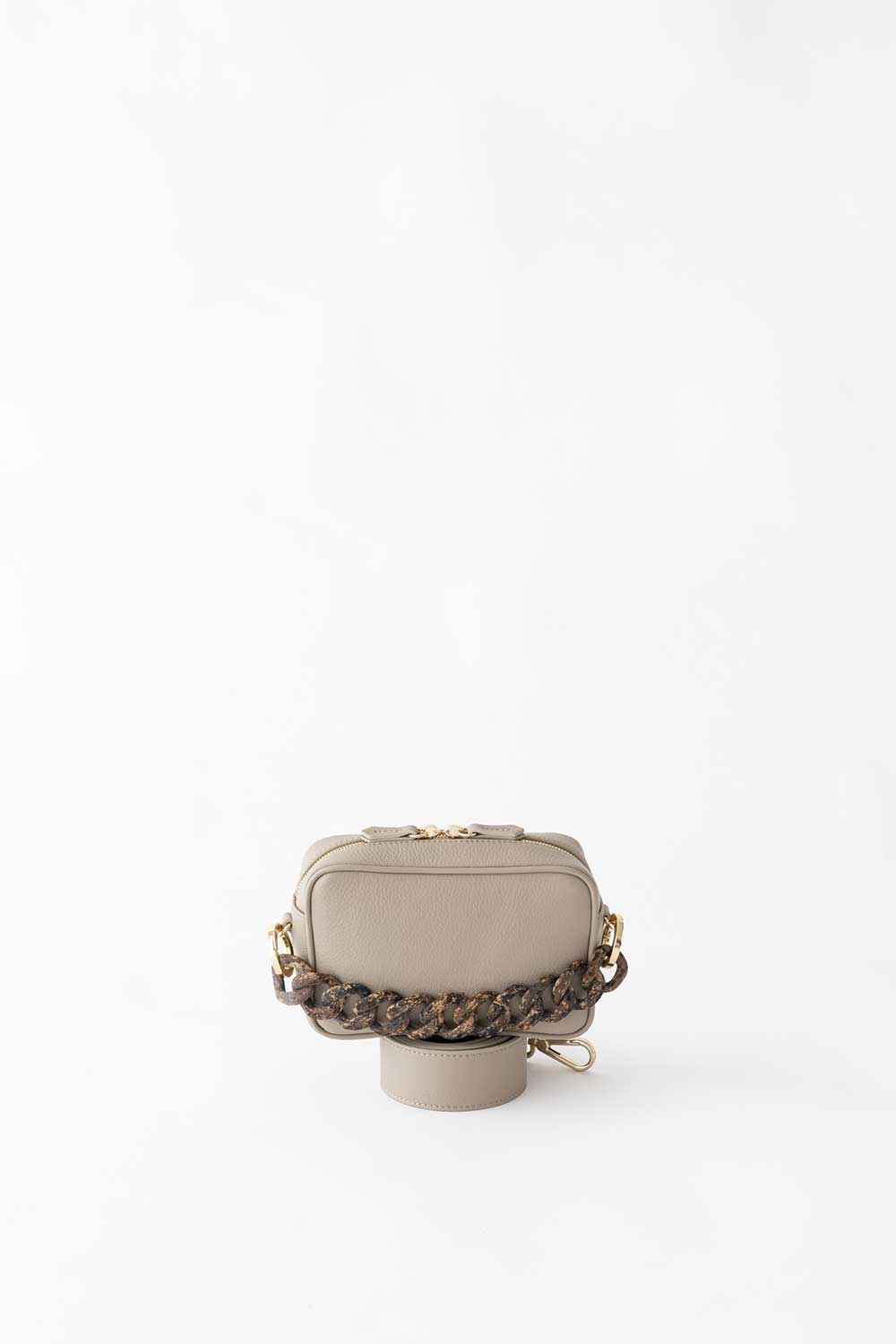The Camera Bag Mignon is made from Greige grained leather. leather shoulder strap and palissandro effect resin Chain.