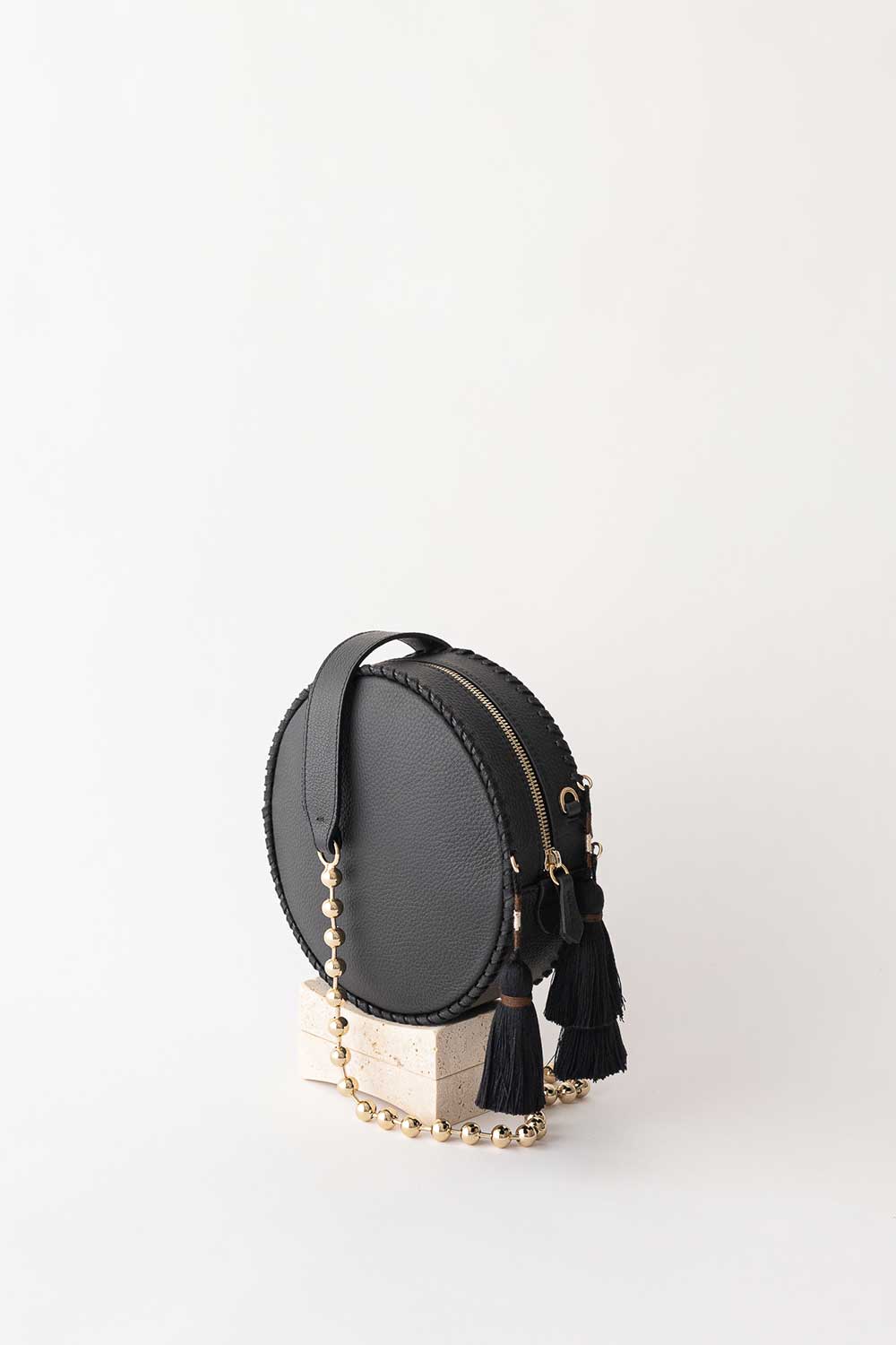 three tassels handmade. Shoulder strap made of light gold chain balls.