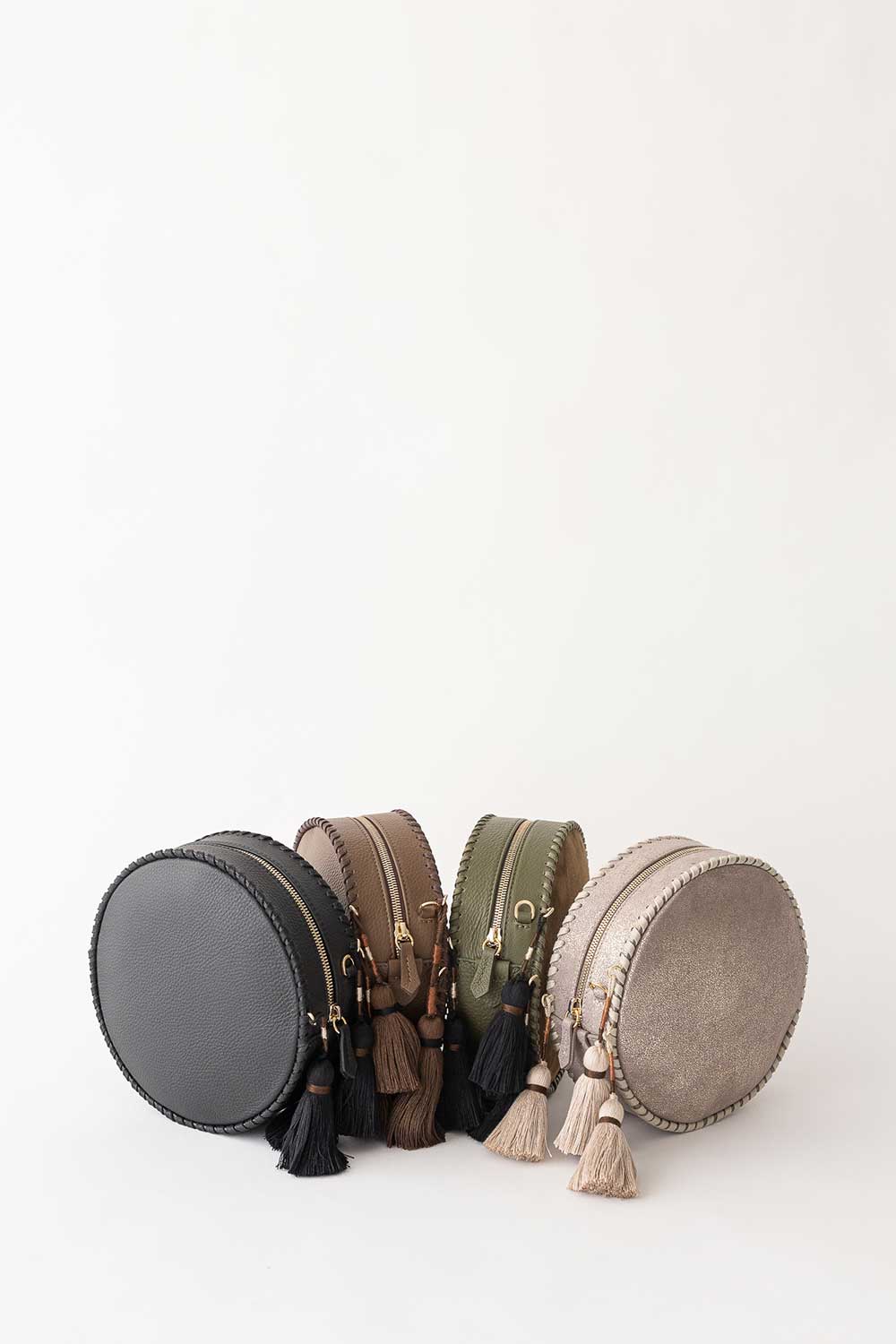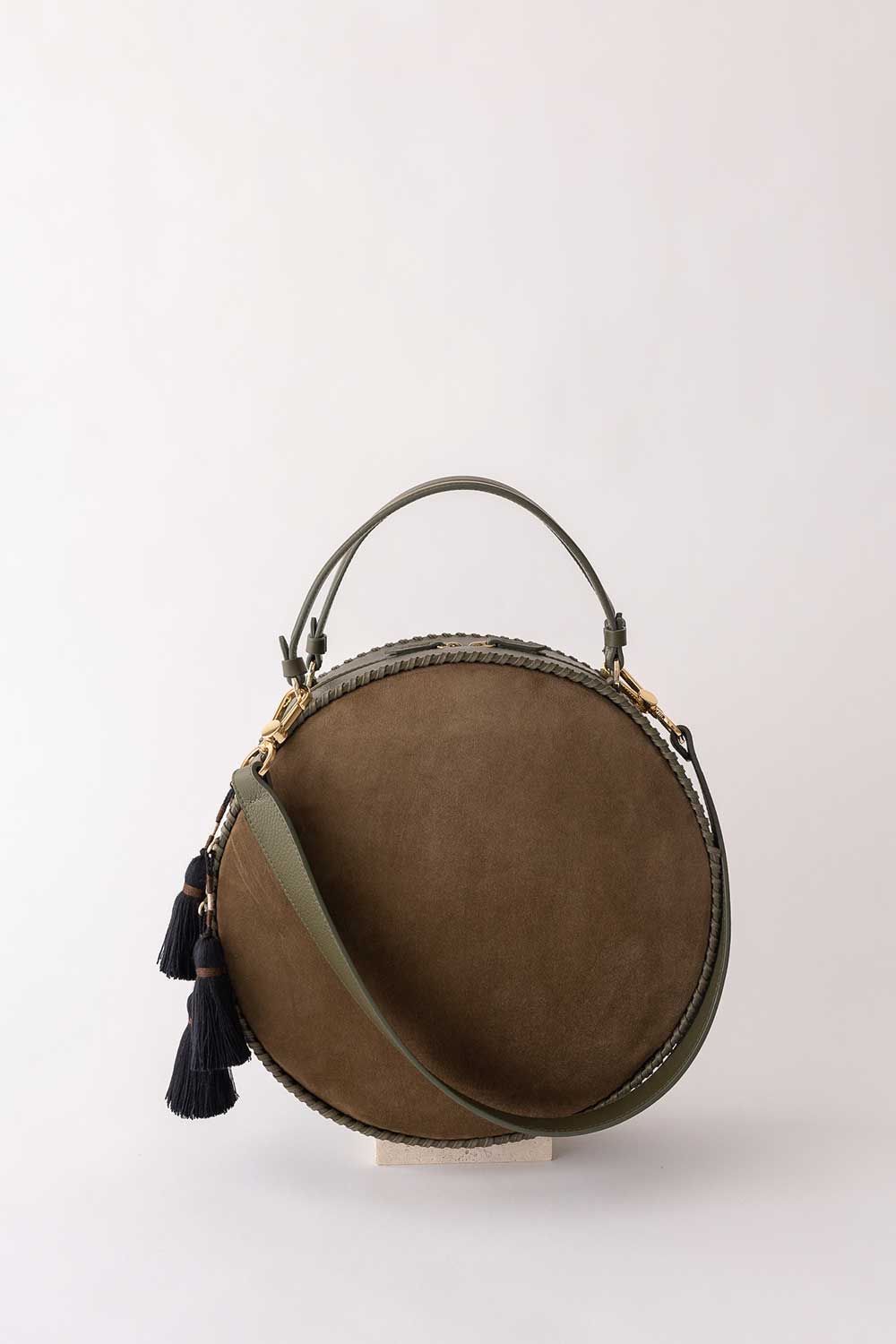 Rounded cross body bag is made from Leather with woven aztec and