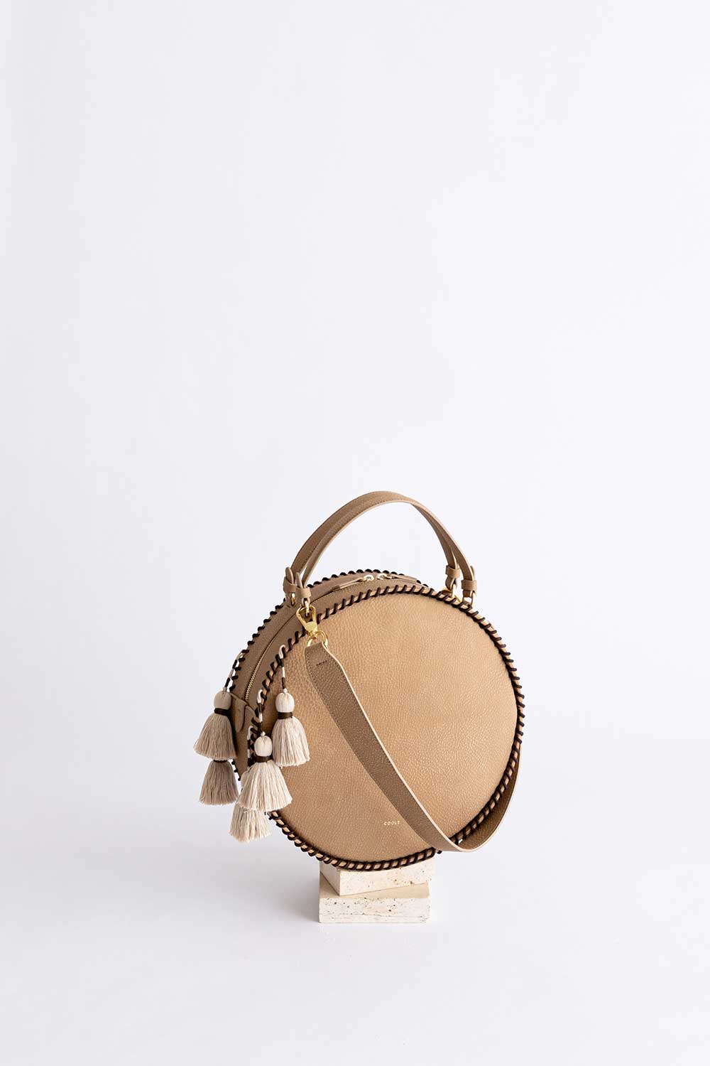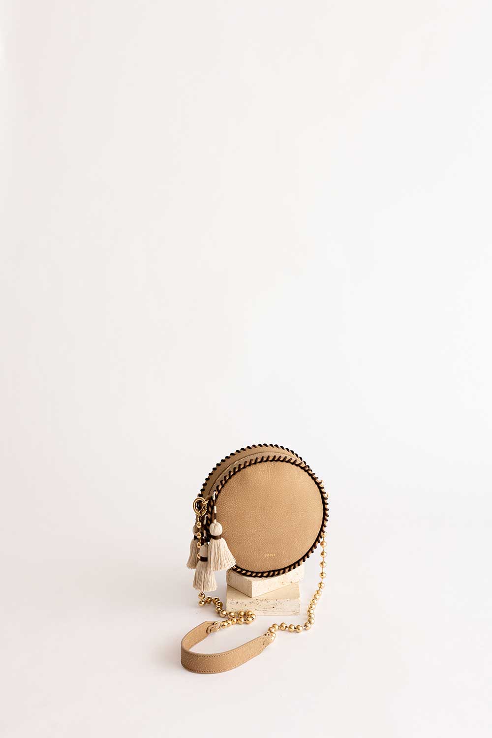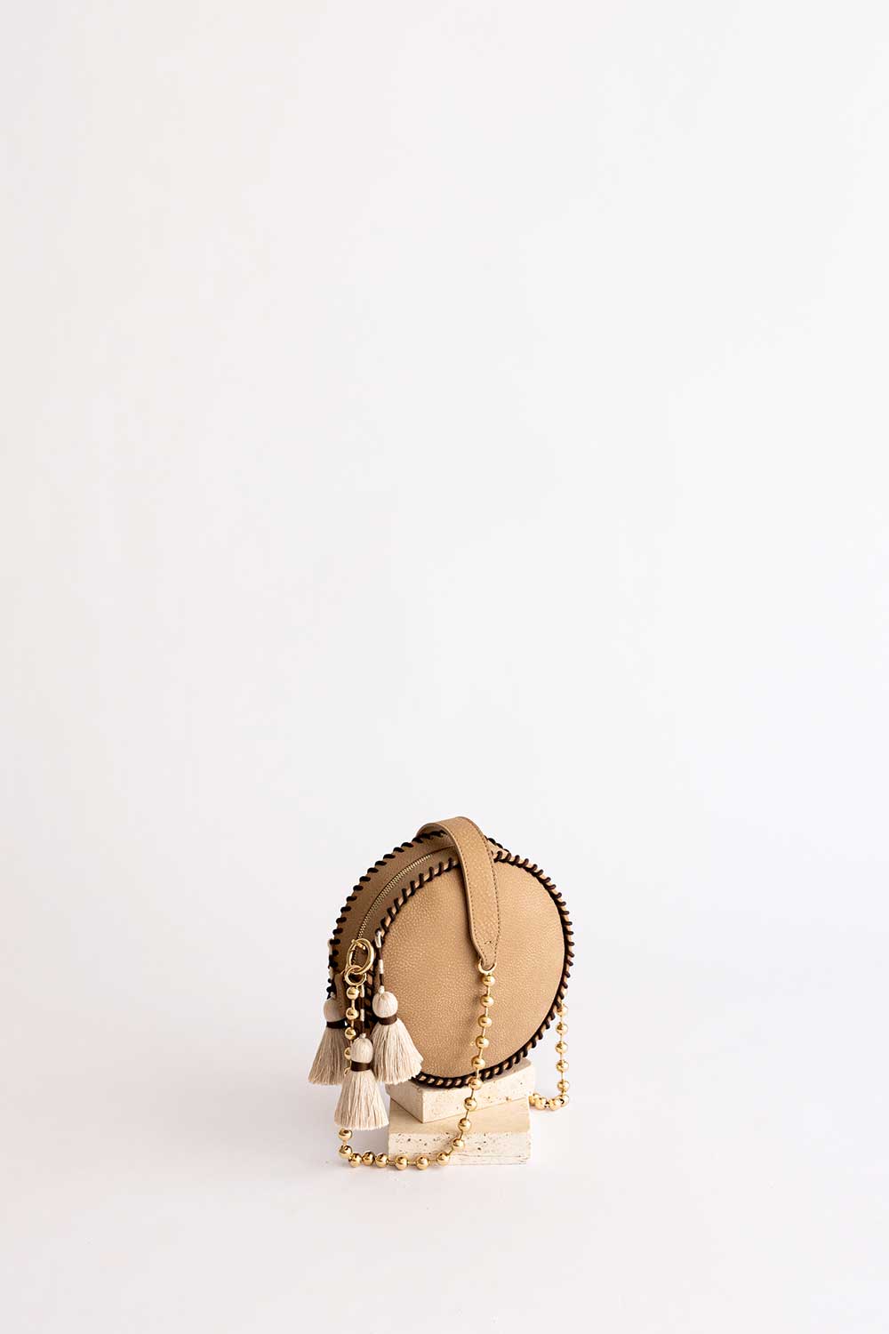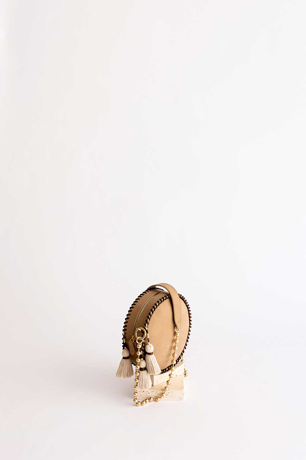Rounded cross body bag is made from Leather with woven aztec and three tassels handmade. Shoulder strap made of bone effect mesh.