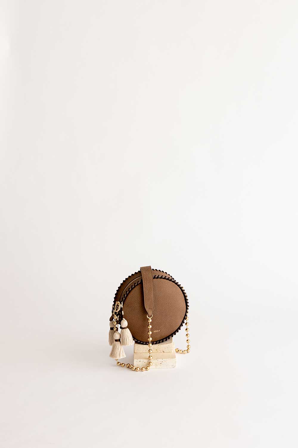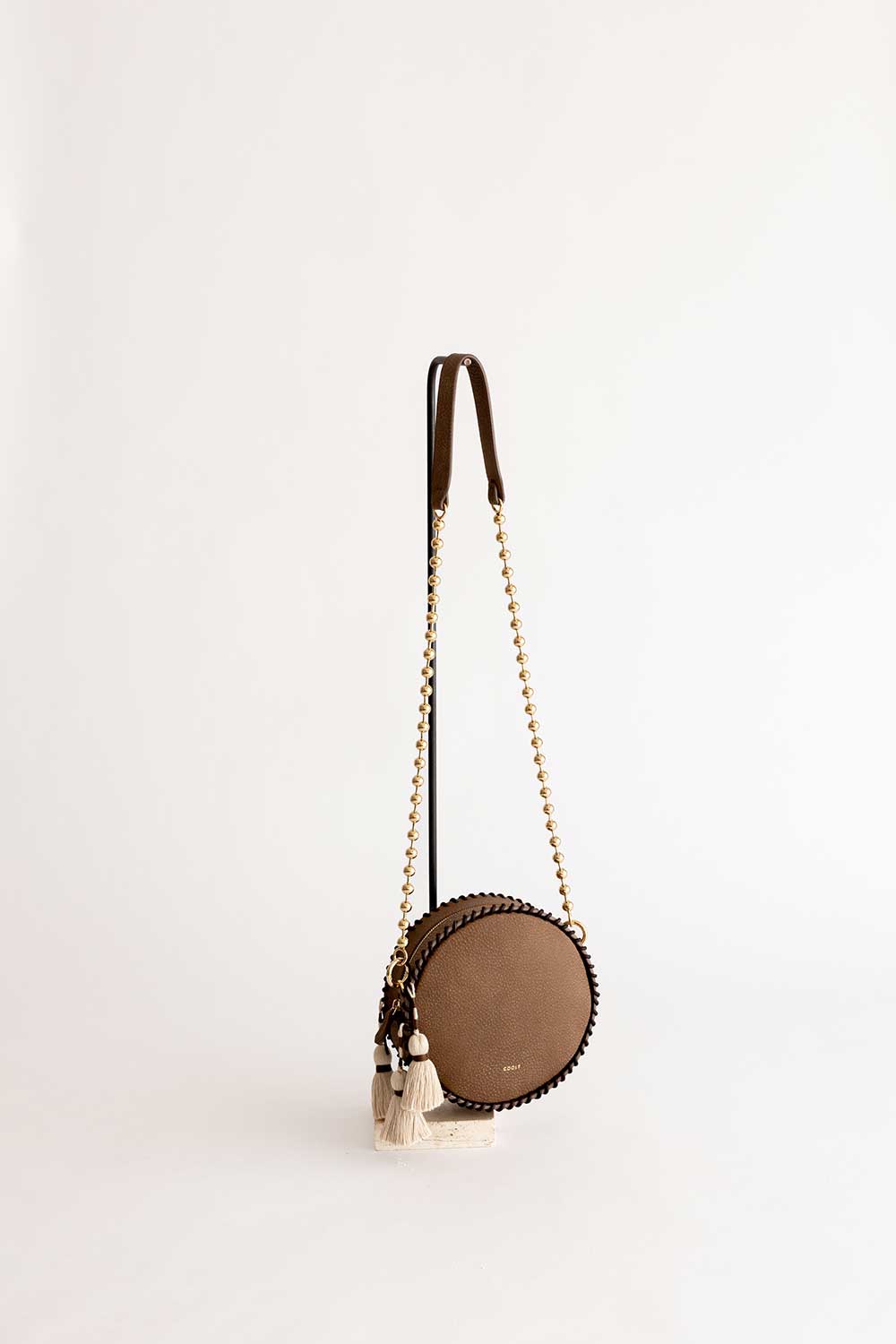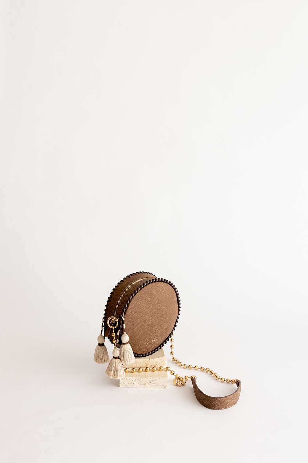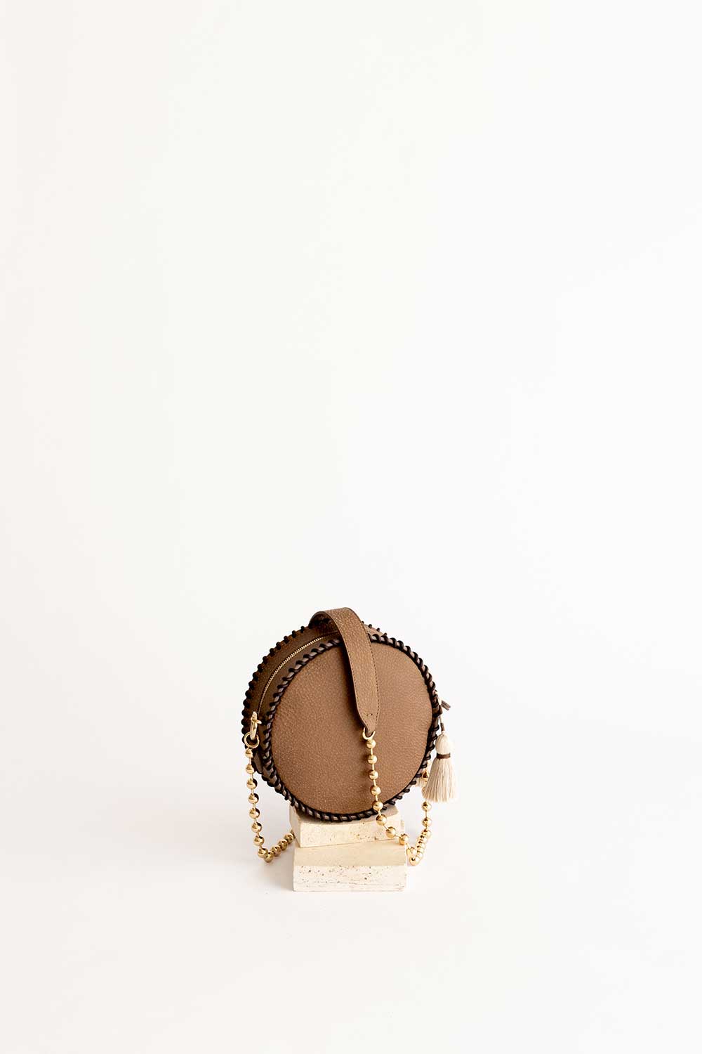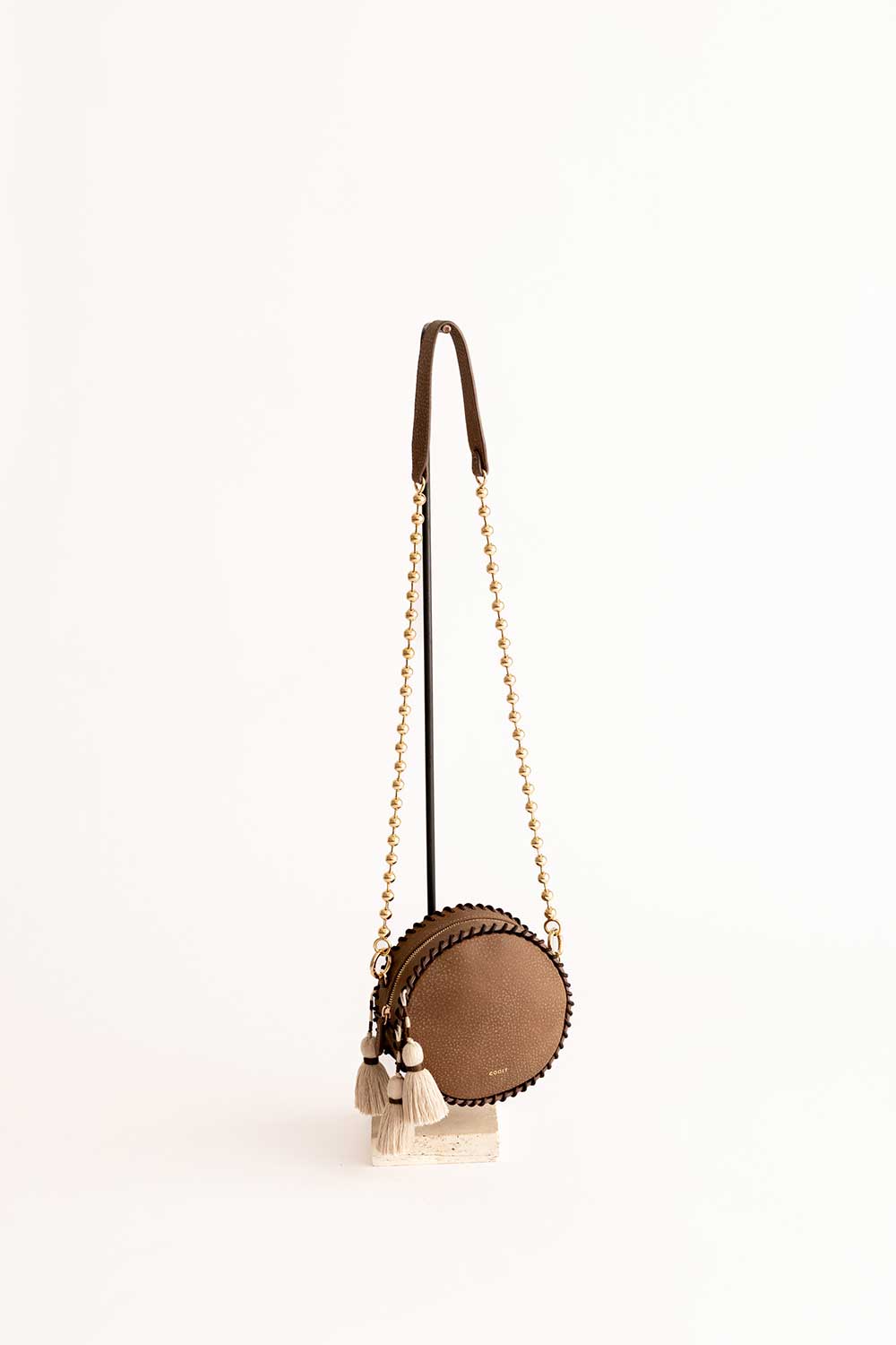 Rounded cross body bag is made from Leather with woven aztec and five tassels handmade. Shoulder strap made of light gold ball chain.