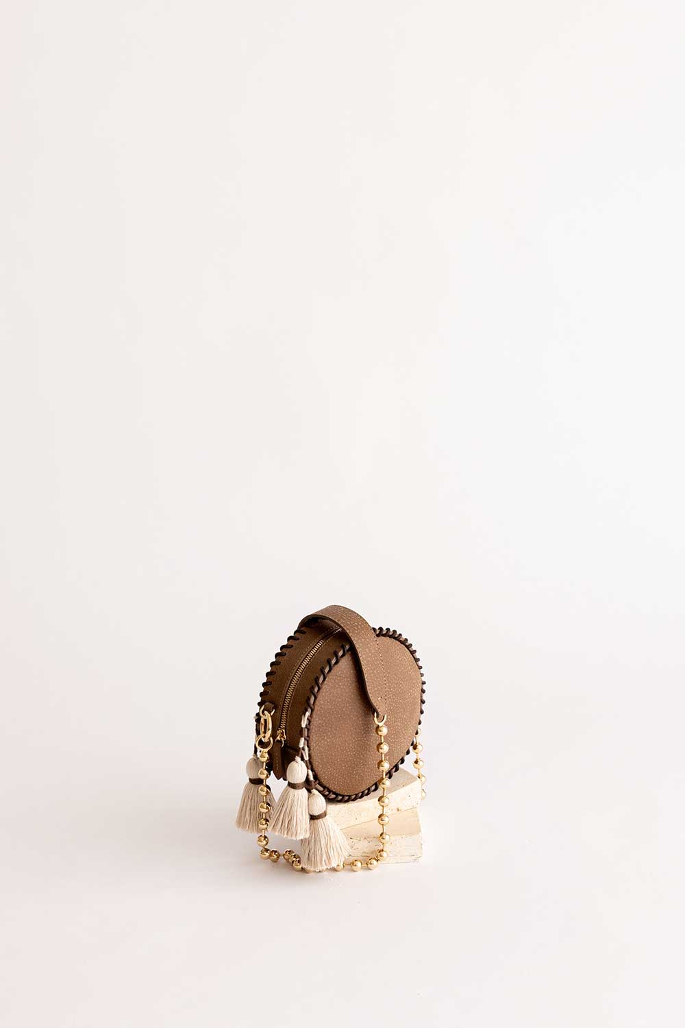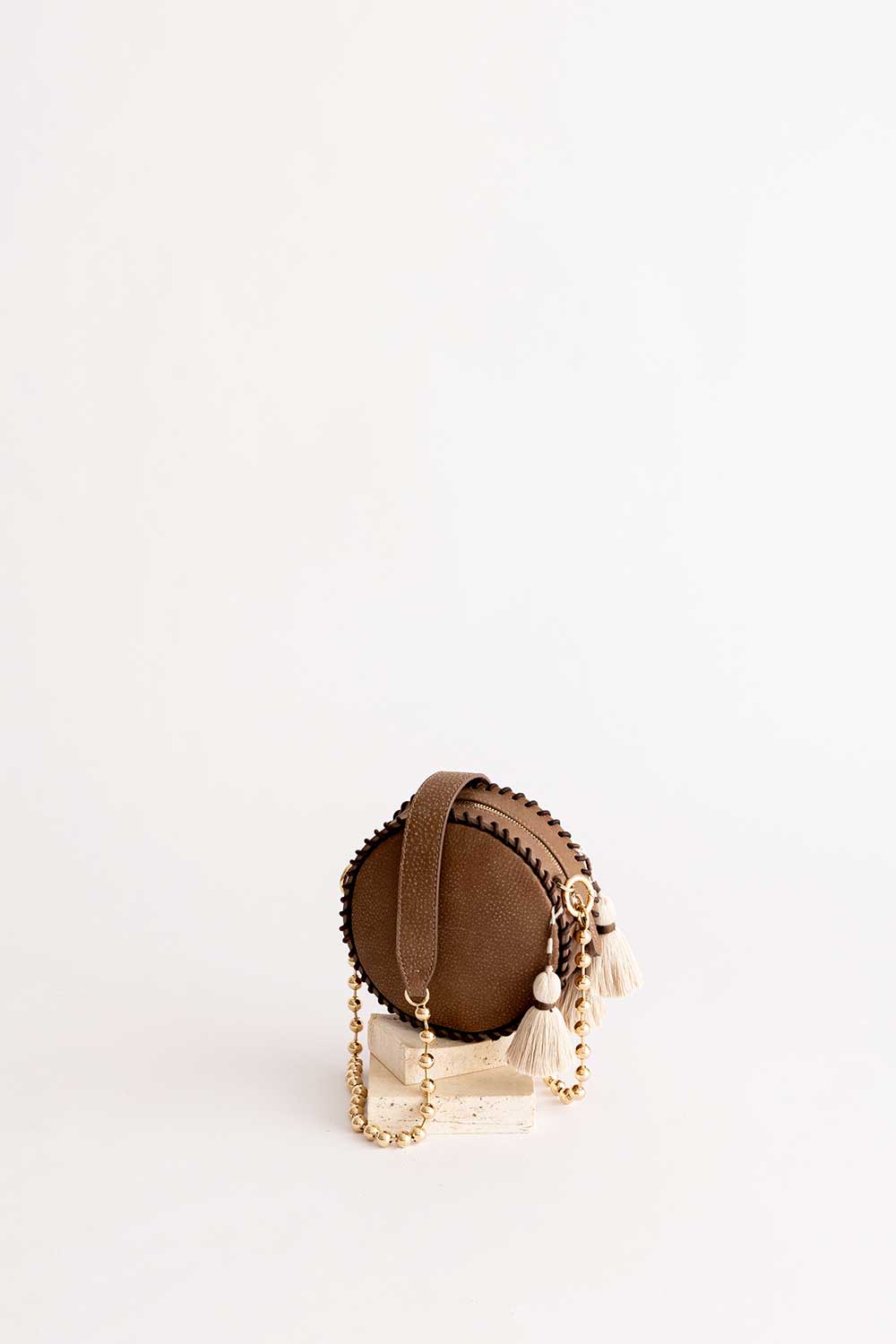 Rounded cross body bag is made from Leather with woven aztec and three tassels handmade.