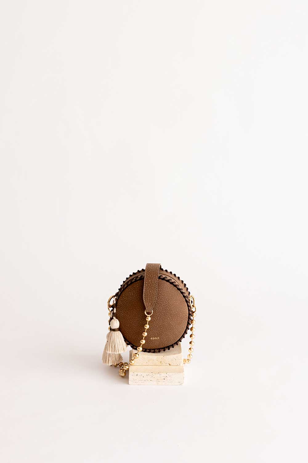 Shoulder strap made of light gold ball chain.