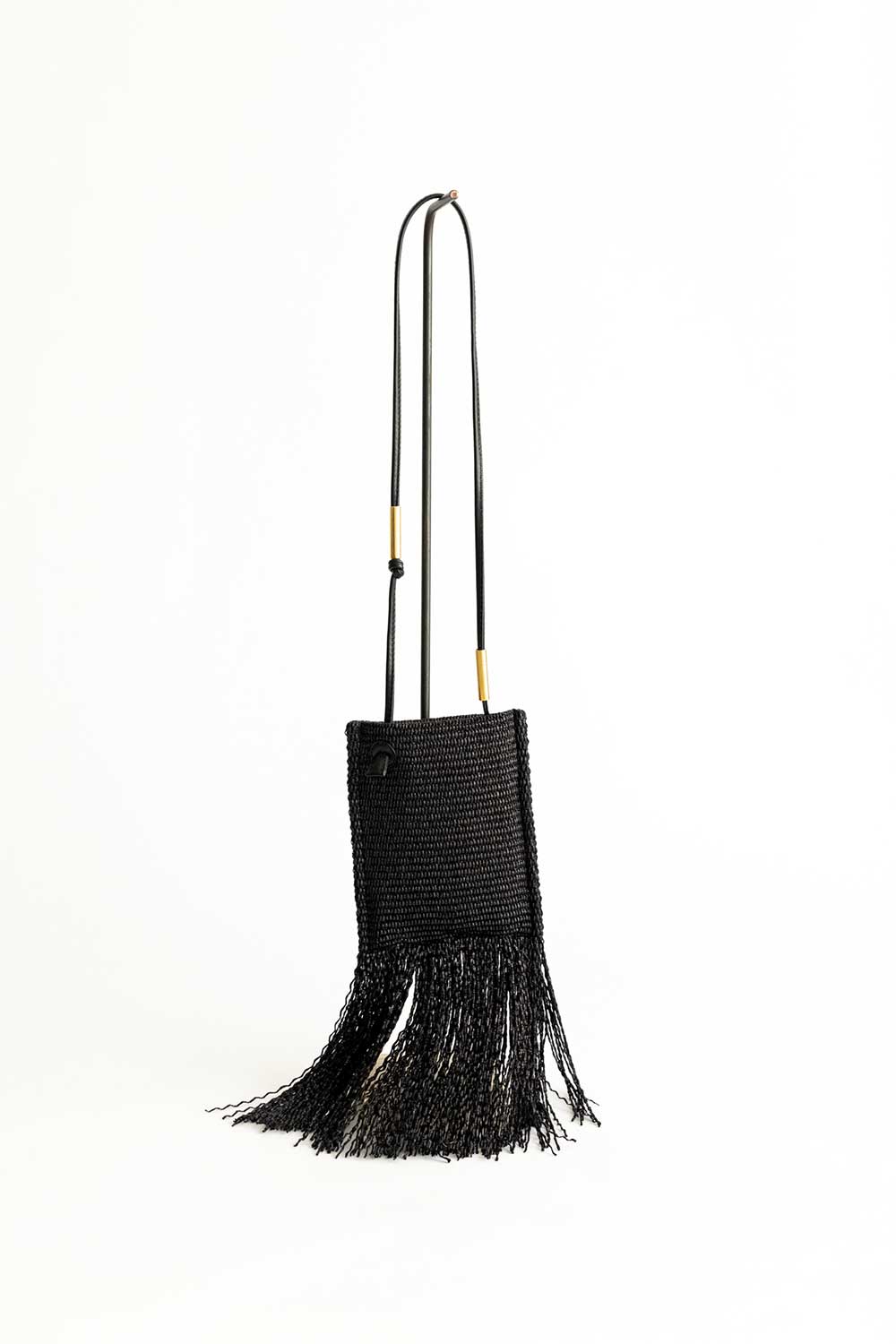 Mini flat bag has been crafted from woven Raffia and leather noir details with long raffia fringe. Sized to store all your essentials.