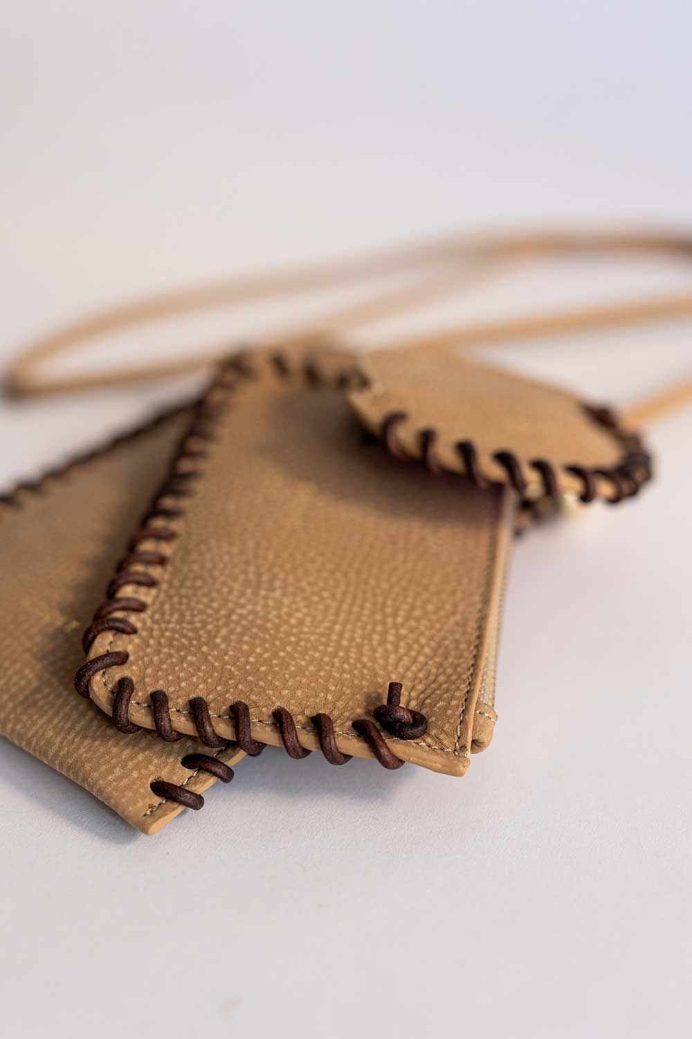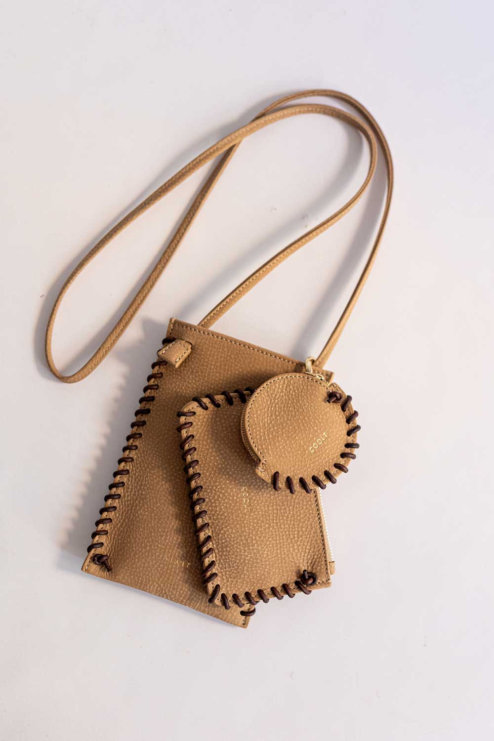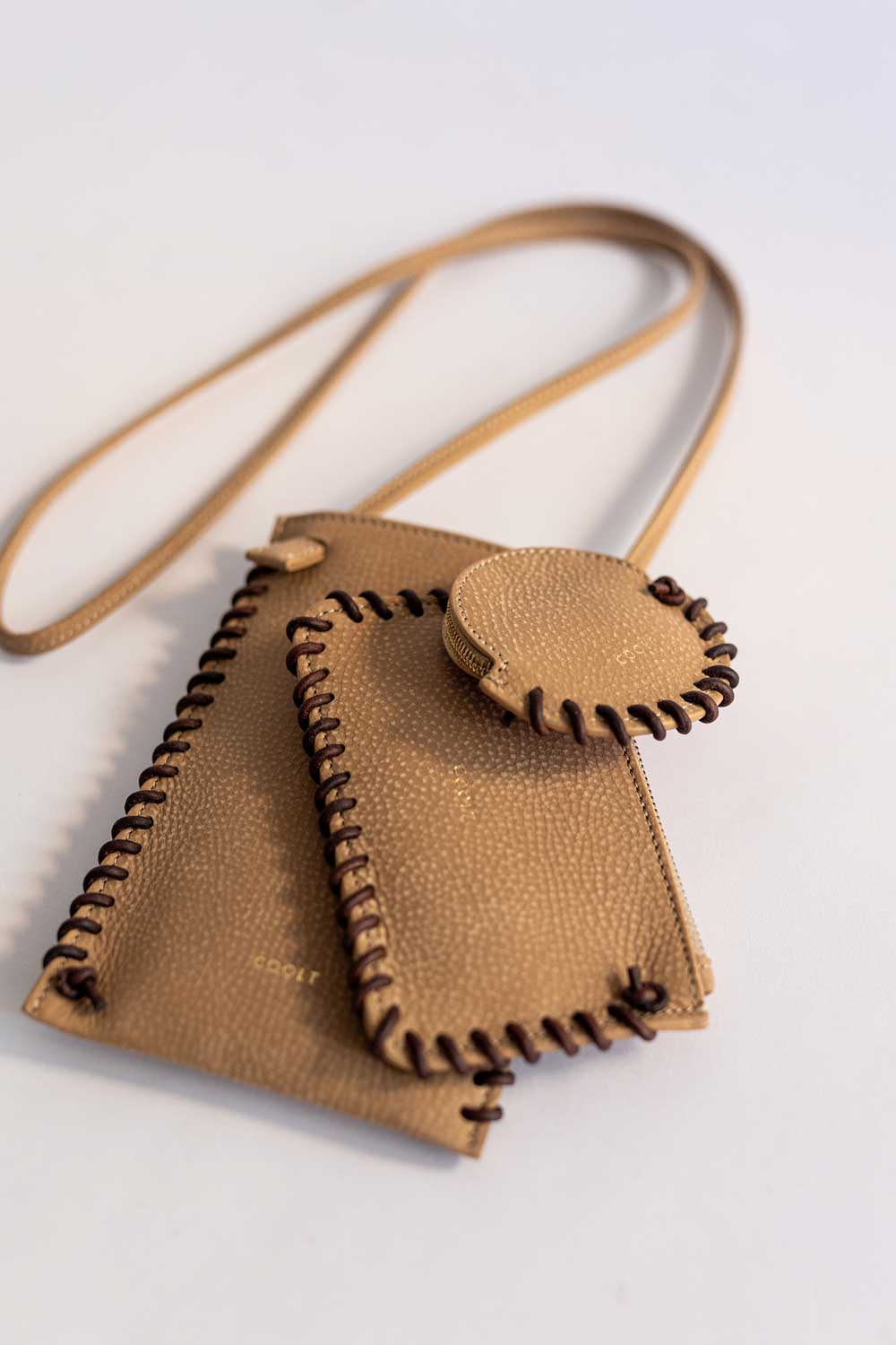 Flat shoulder bag Phone case with two accessories, card and coin case, in Sand nubuck leather.