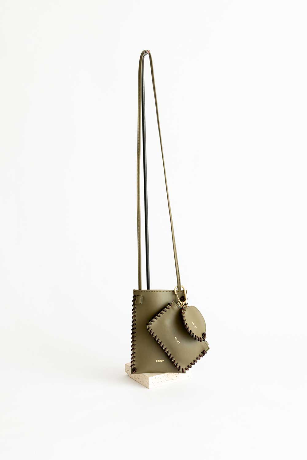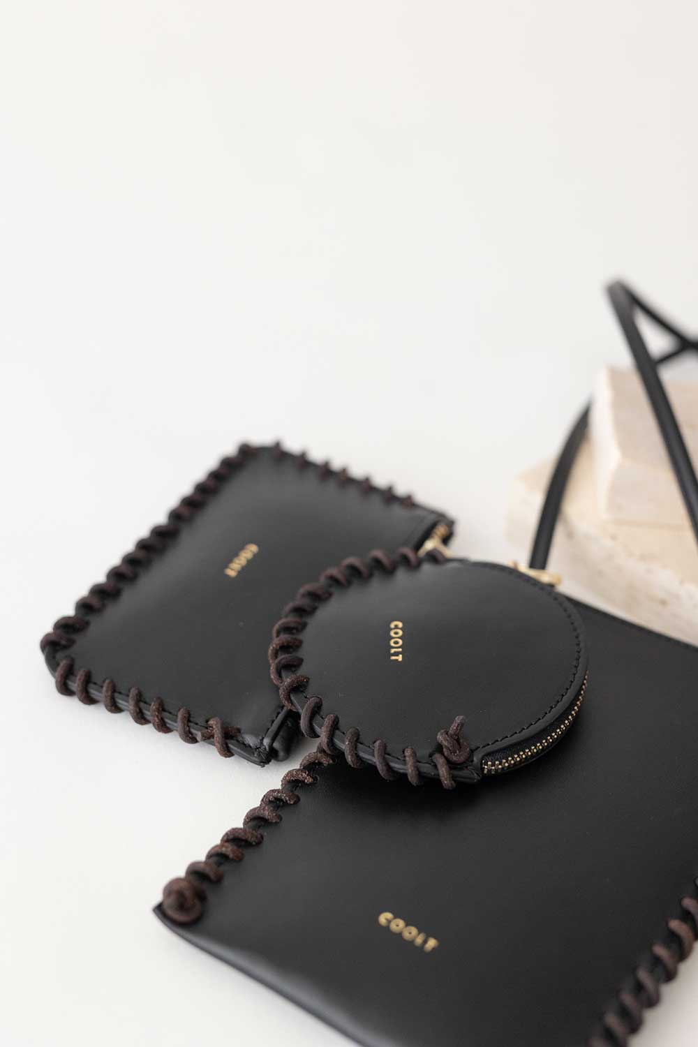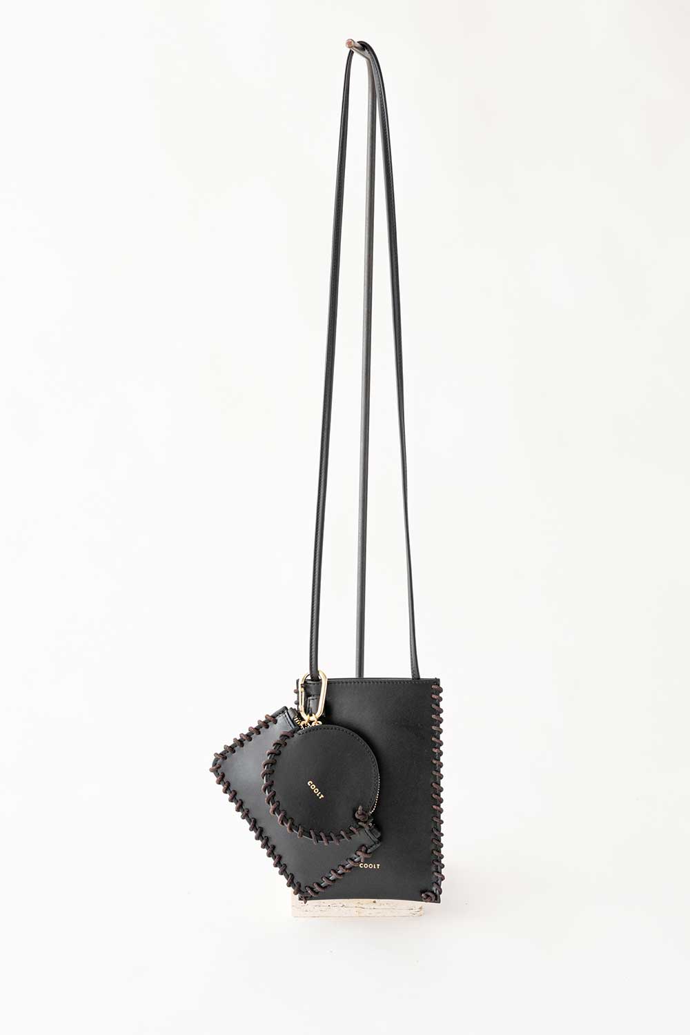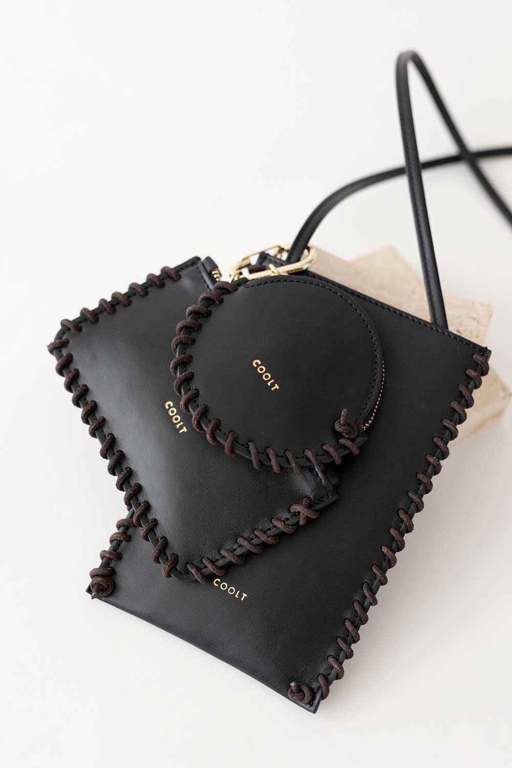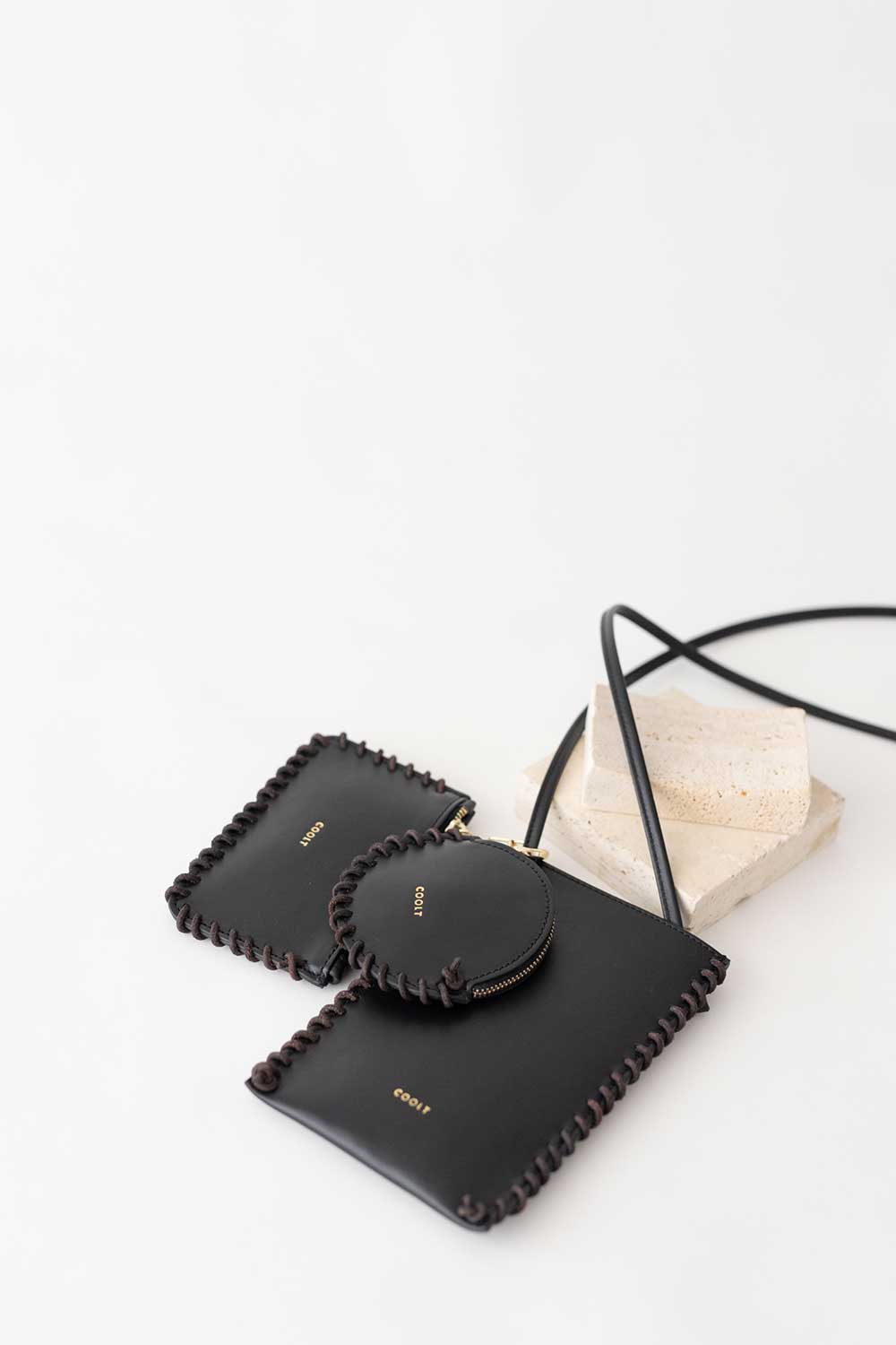 Flat shoulder bag Phone case with two accessories, card and coin case, in smooth black leather.