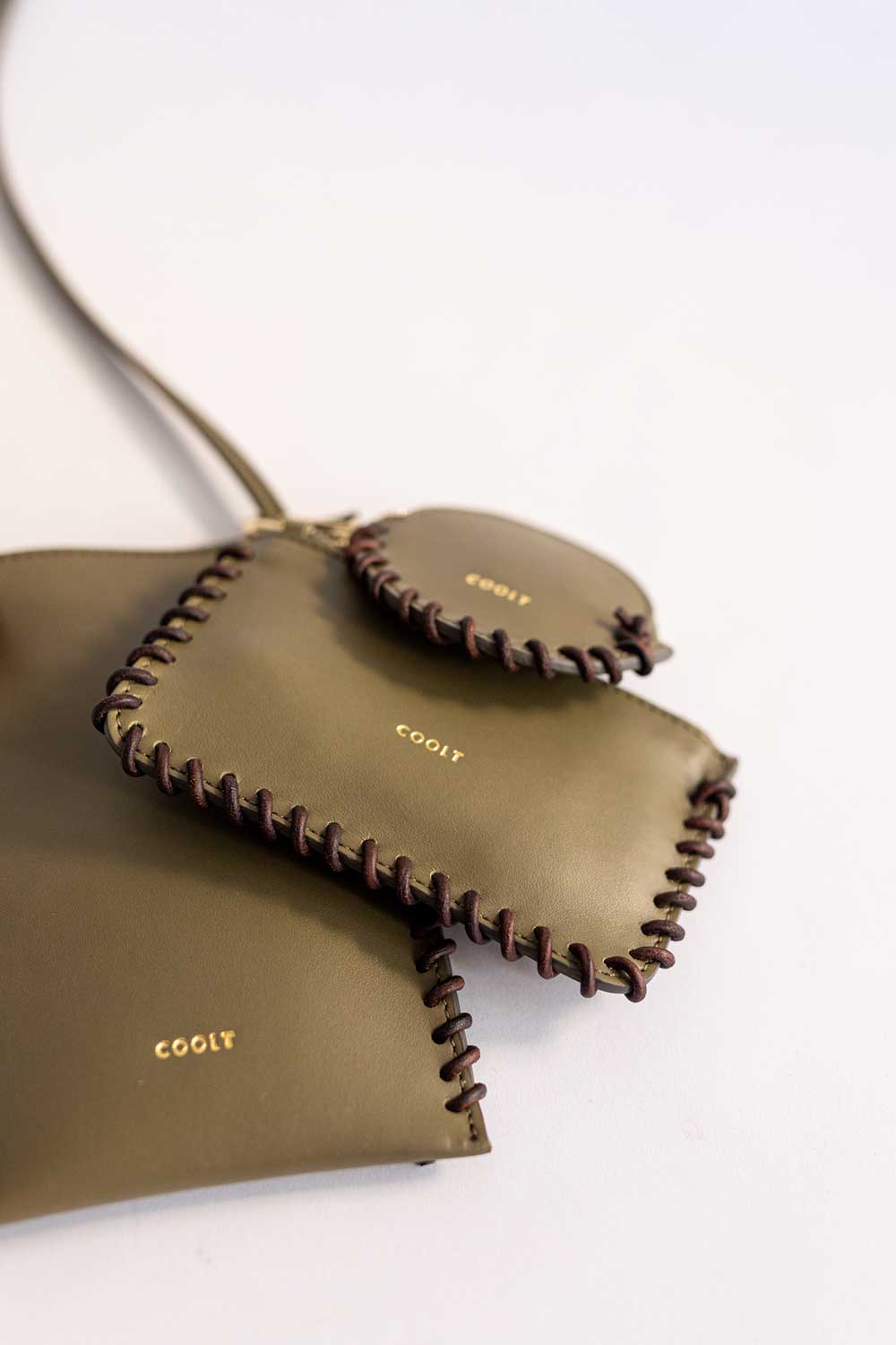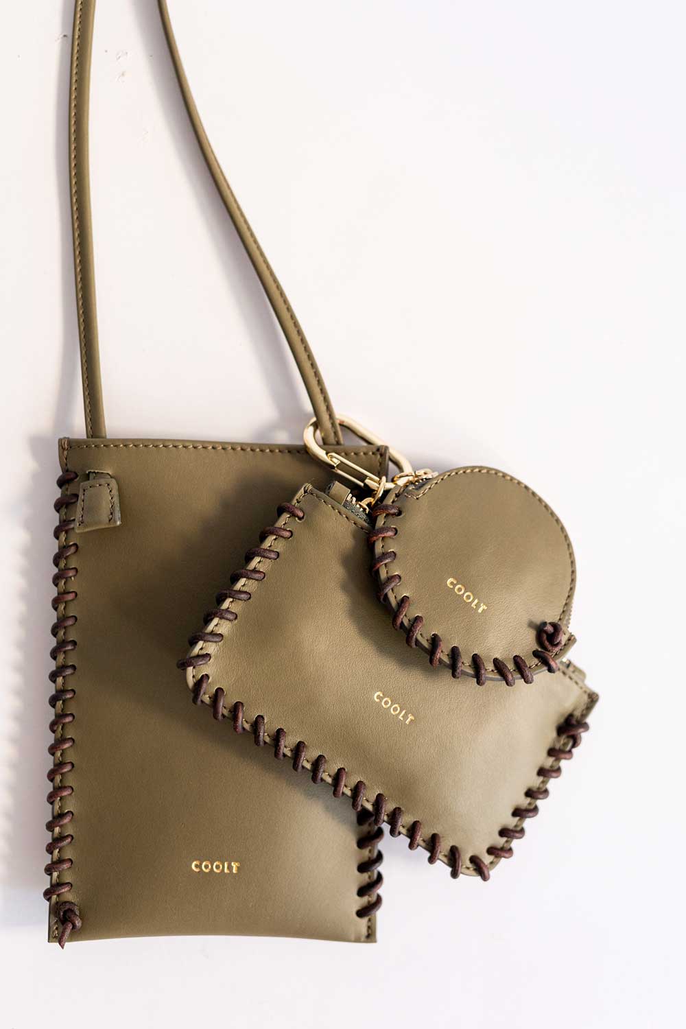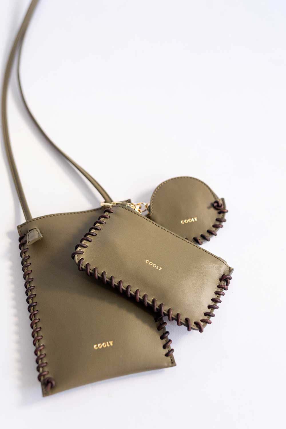 Flat shoulder bag Phone case with two accessories, card and coin case, in smooth olive leather.