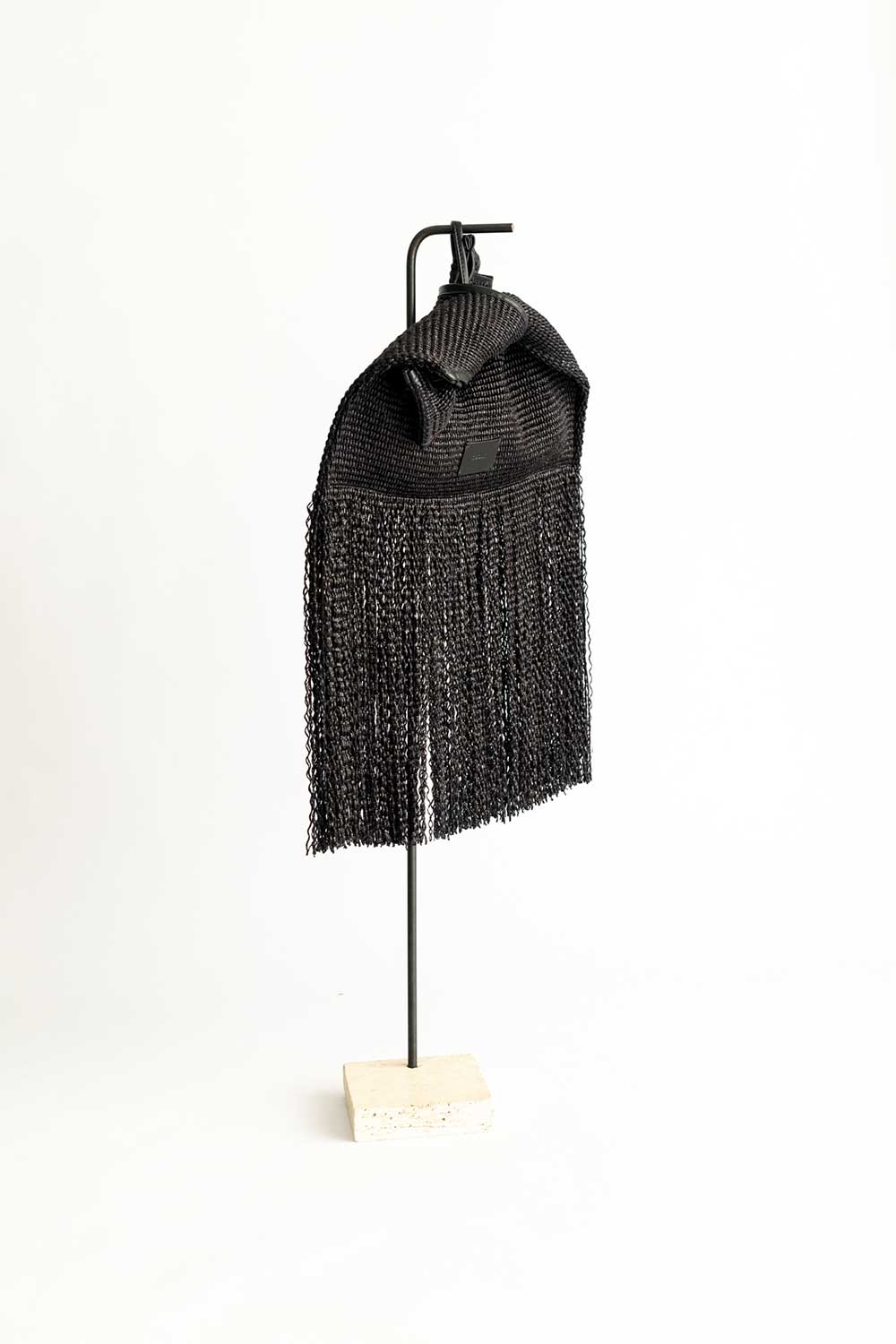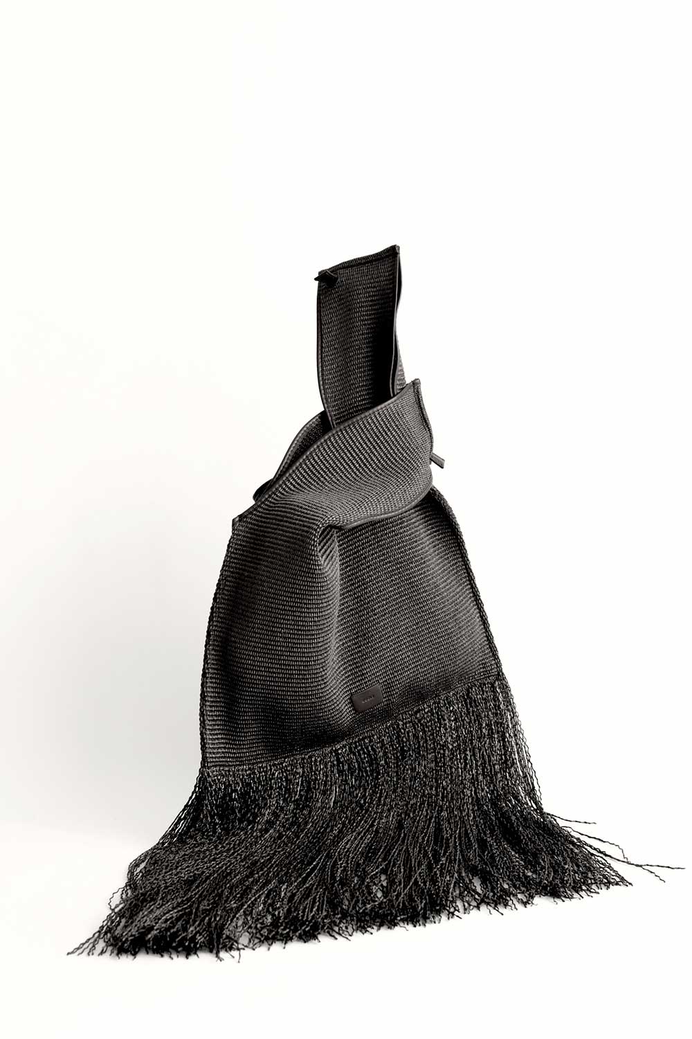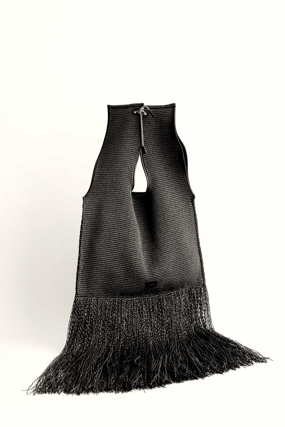 Shopper flat bag has been crafted from woven Raffia finished with noir leather. Has the shape of a soft big flat shopping bag with long raffia fringes.