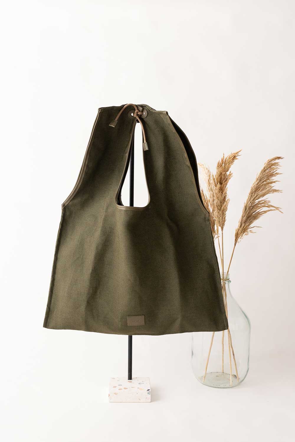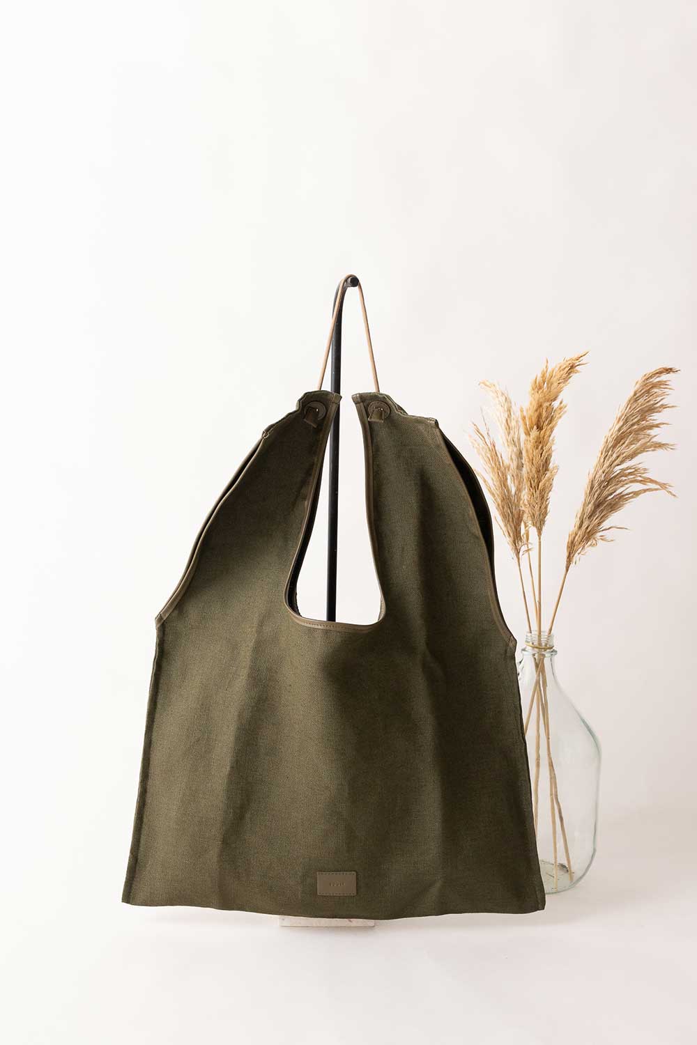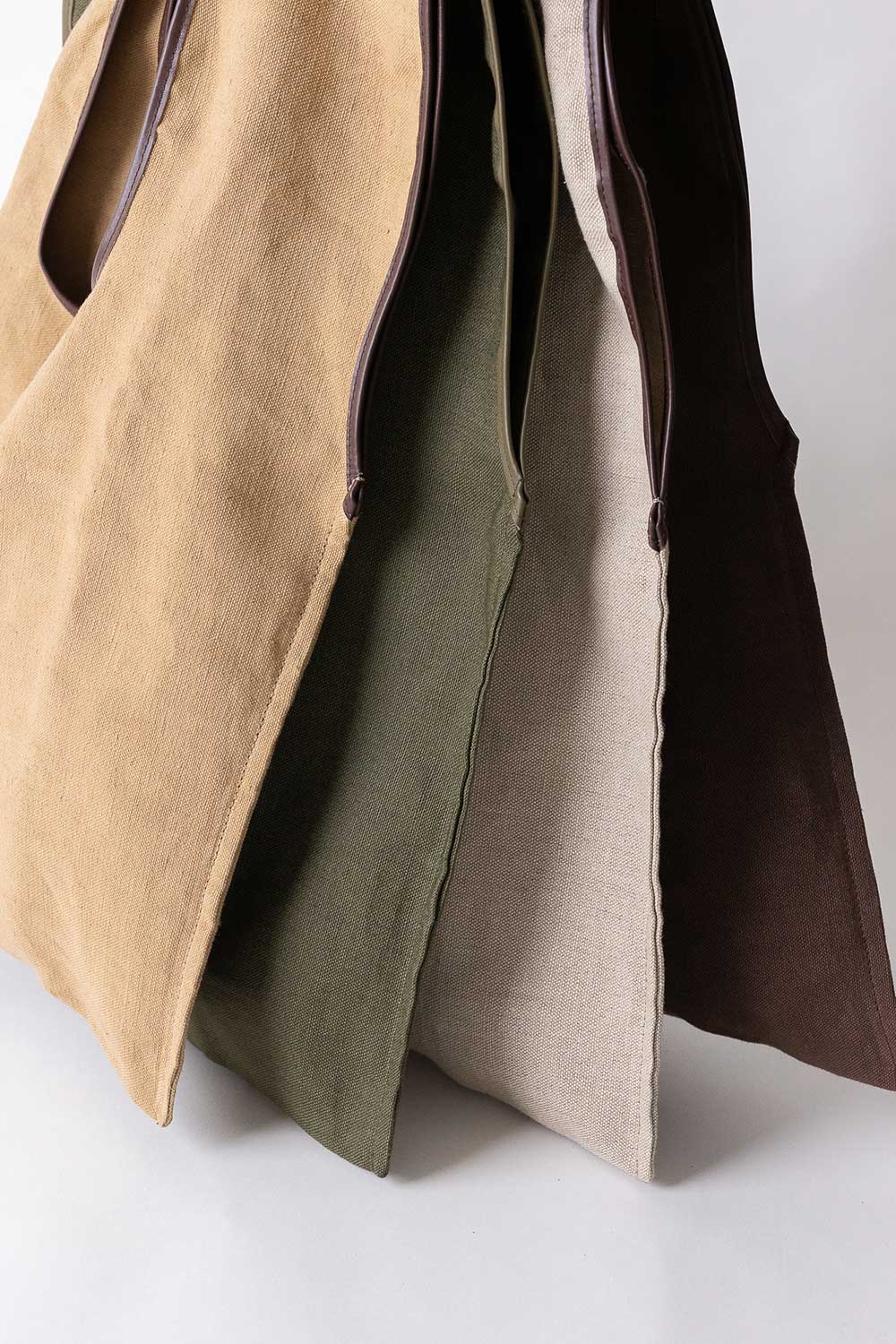 Shopper flat bag has been crafted from linen finished with Olive leather. Has the shape of a soft big flat shopping bag .