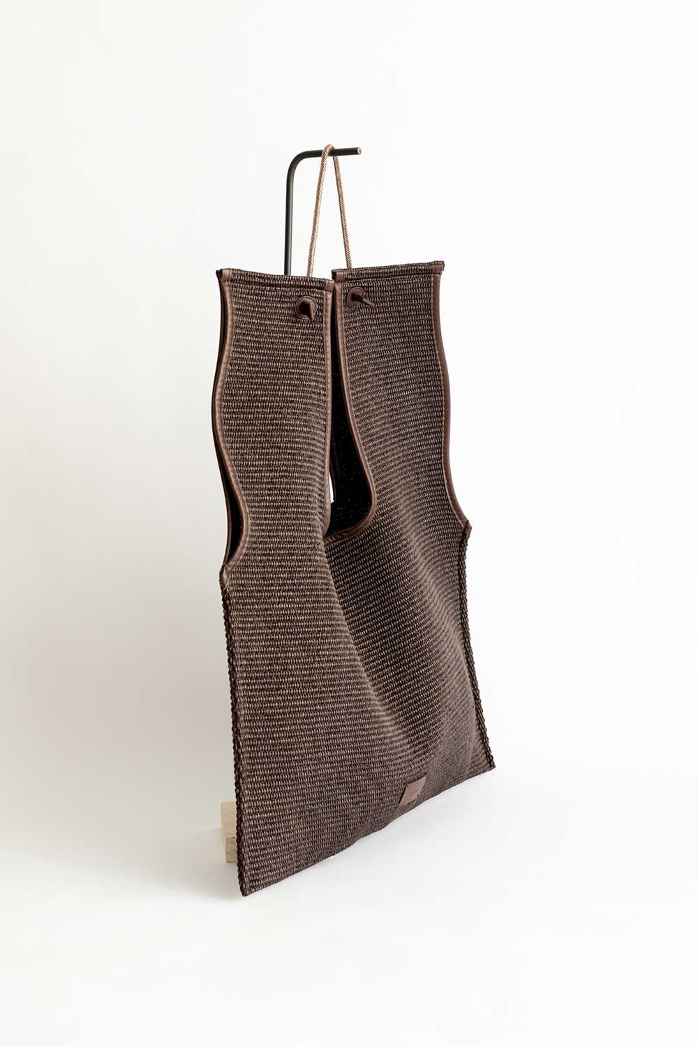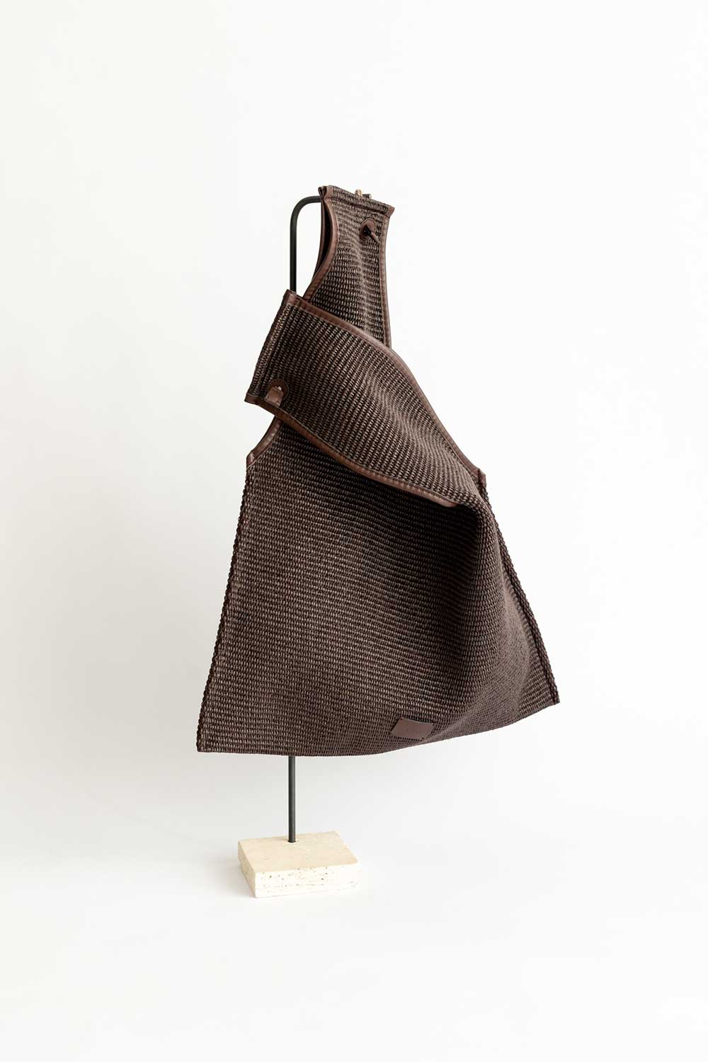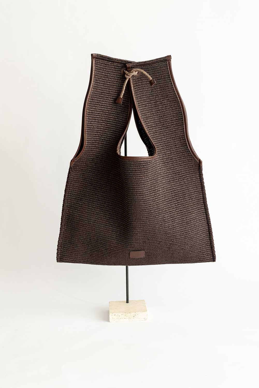 Shopper flat bag has been crafted from woven Raffia finished with Cacao leather. Has the shape of a soft big flat shopping bag .