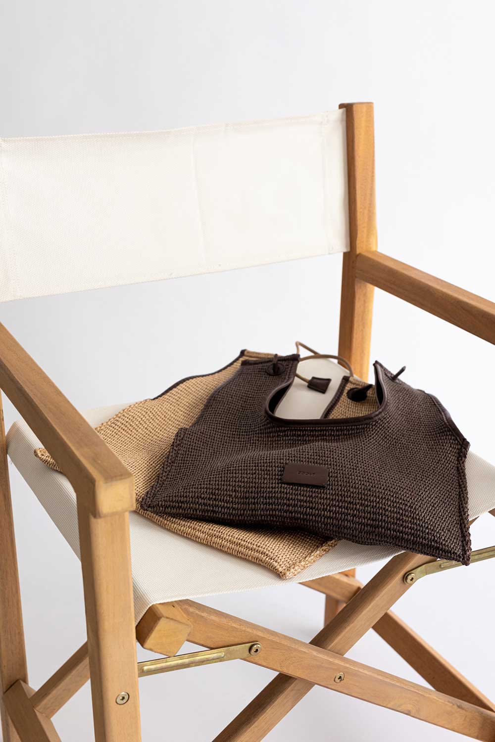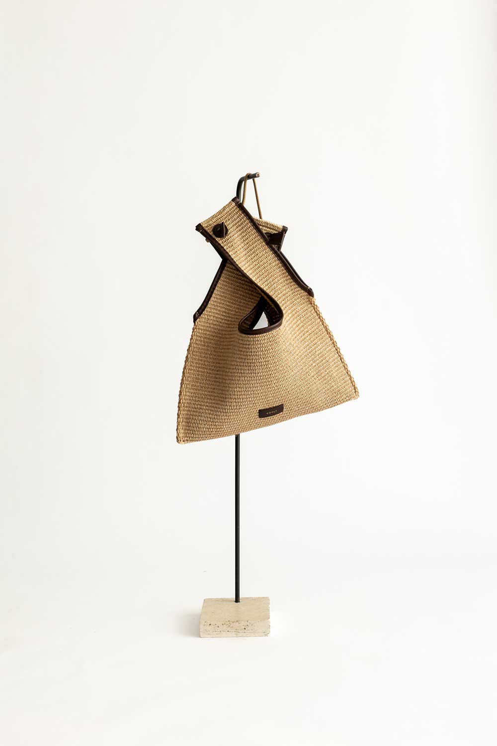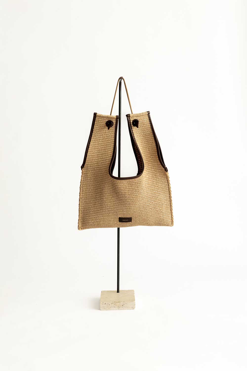 Shopper flat bag has been crafted from Natural woven Raffia finished with Cacao leather. Has the shape of a mini flat shopping bag .