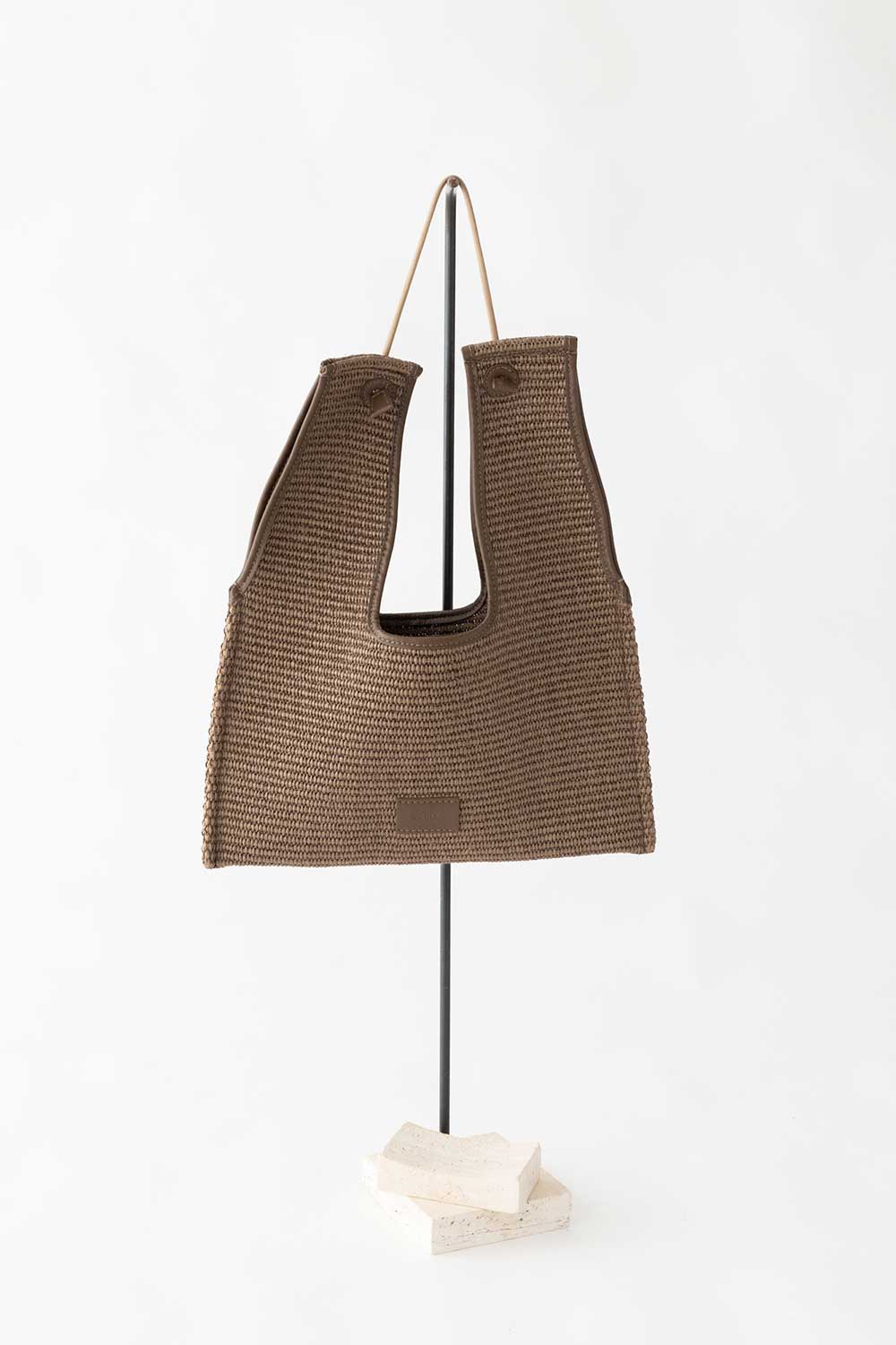 Shopper flat bag has been crafted from Natural woven Raffia finished with Cacao leather.