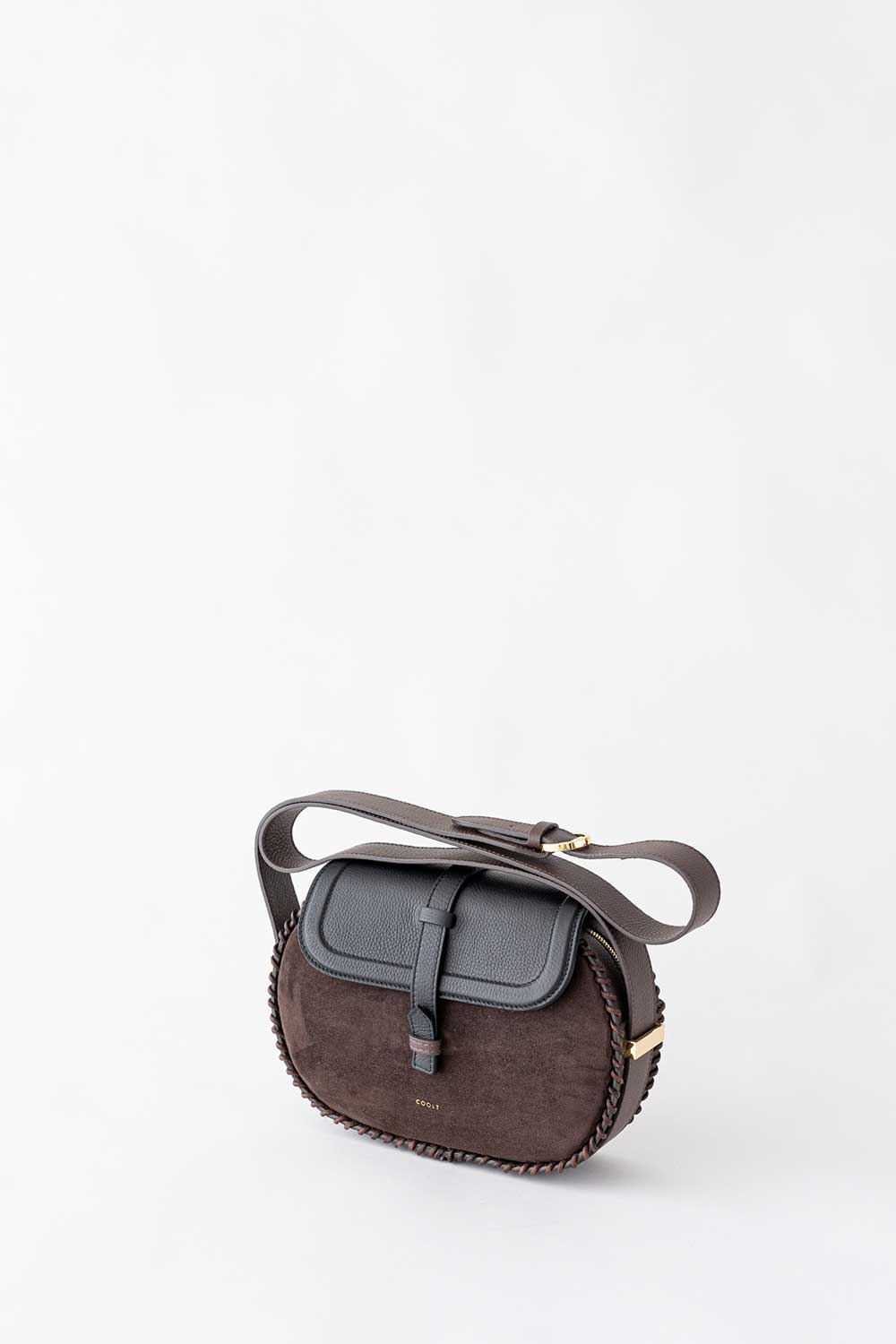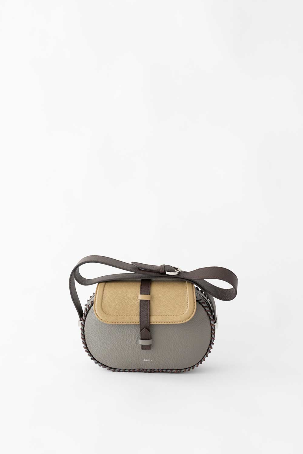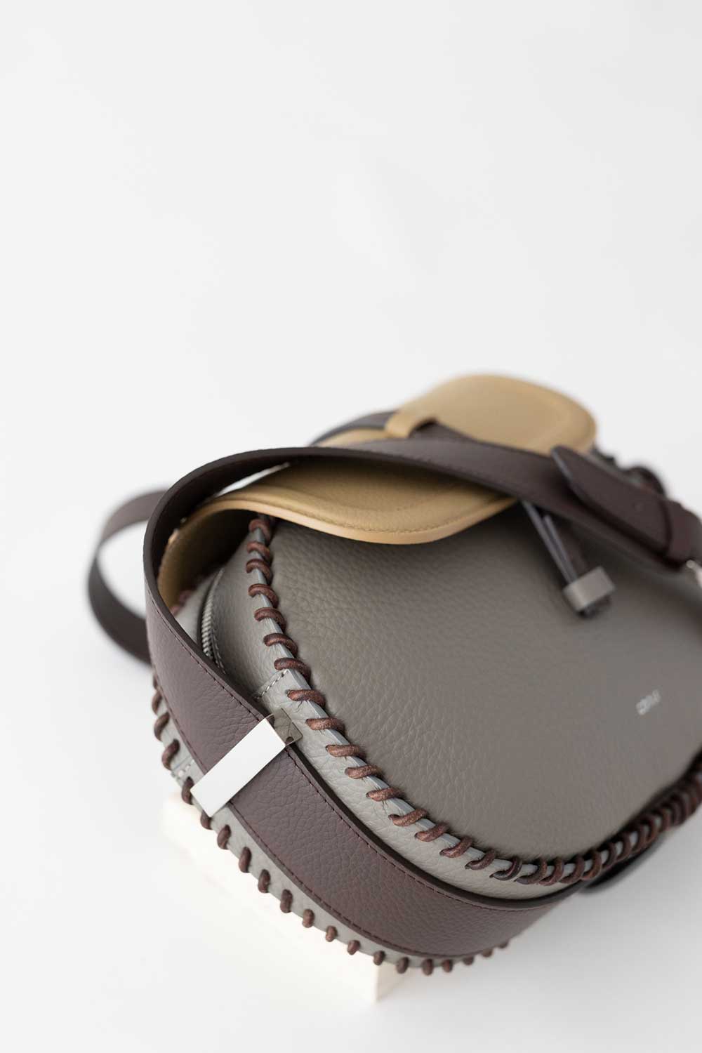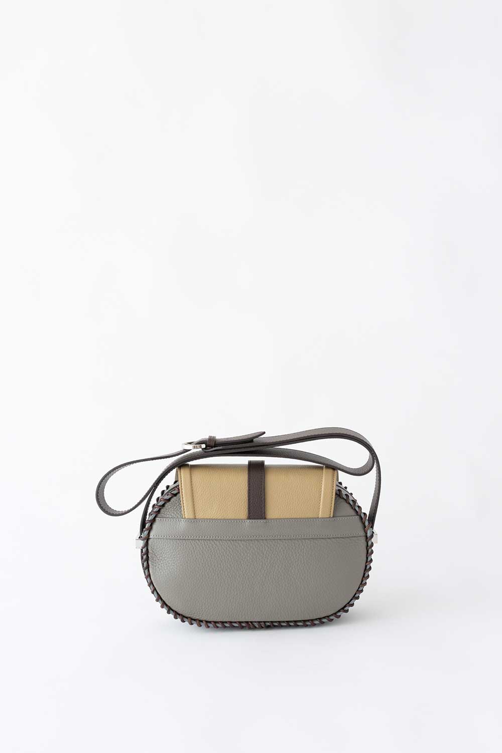 Shoulder bag grey with leather flap in beige iota and Aztec weave with cacao leather lace, shoulder strap made of testa di moro leather.