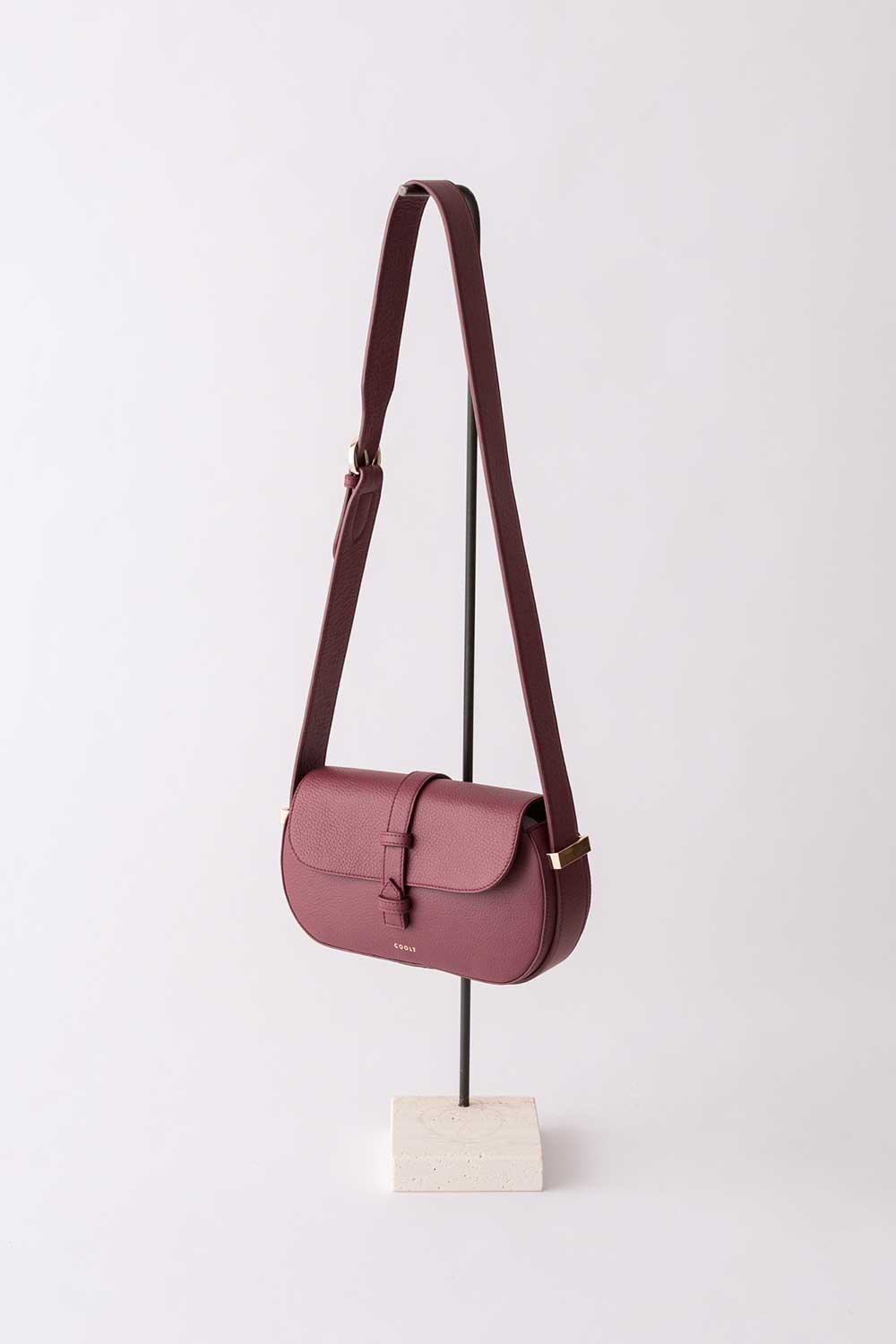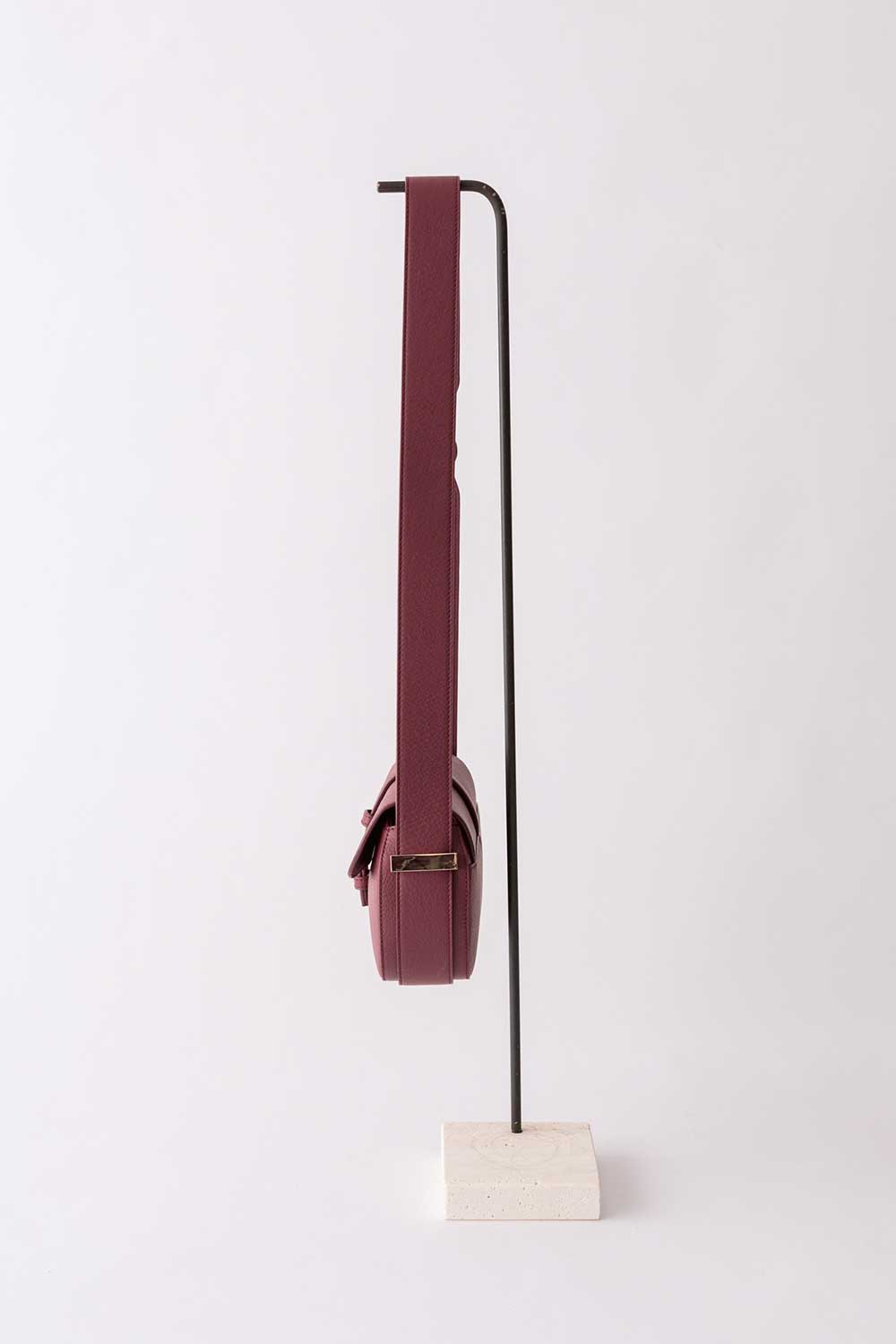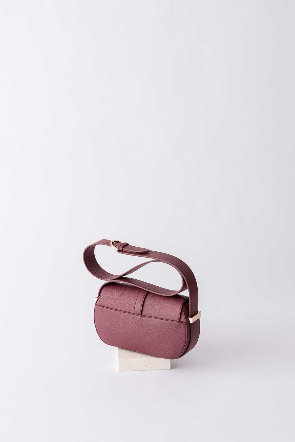Shoulder bag in Amaranto leather with leather flap. Shoulder strap made of amaranto grained leather.