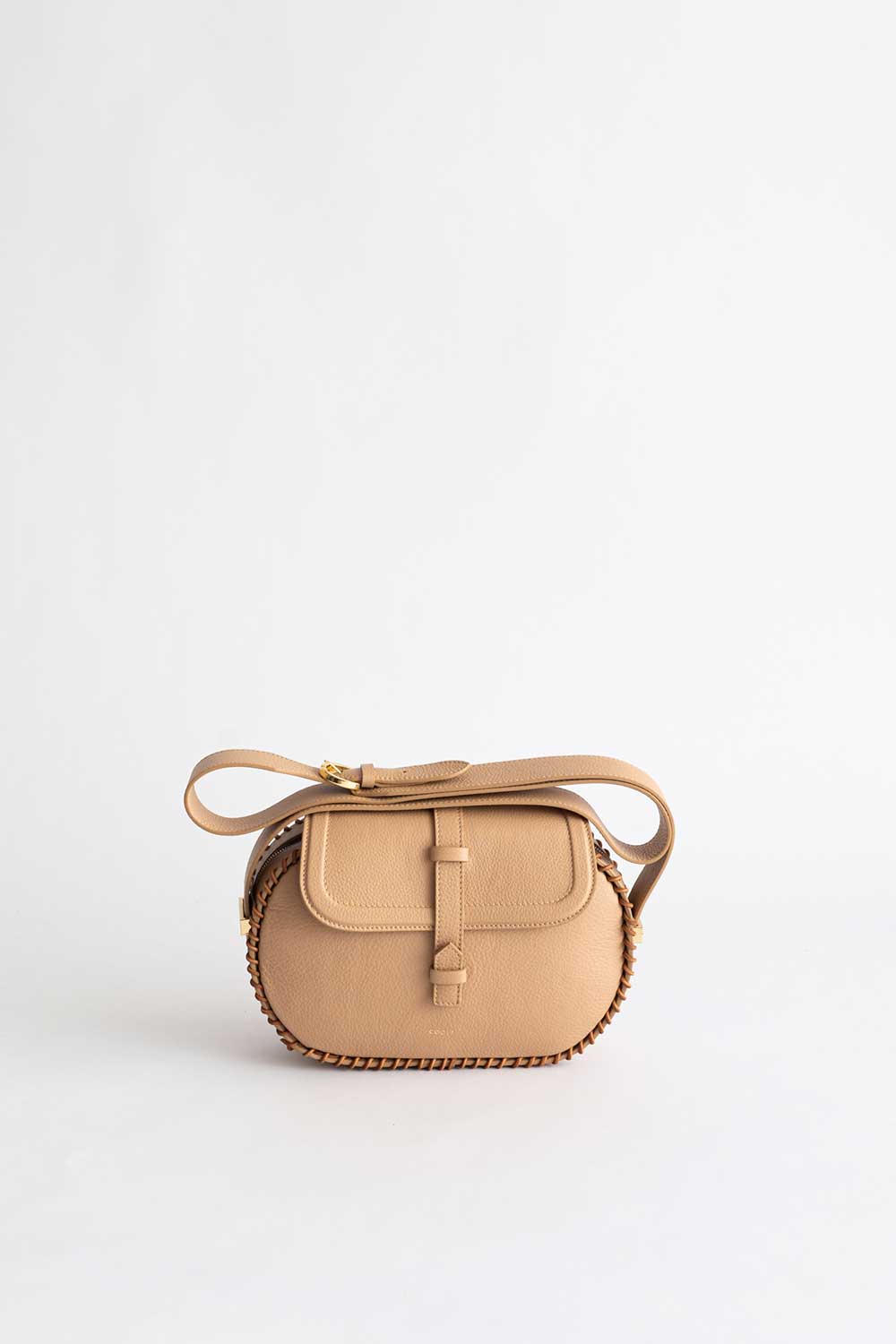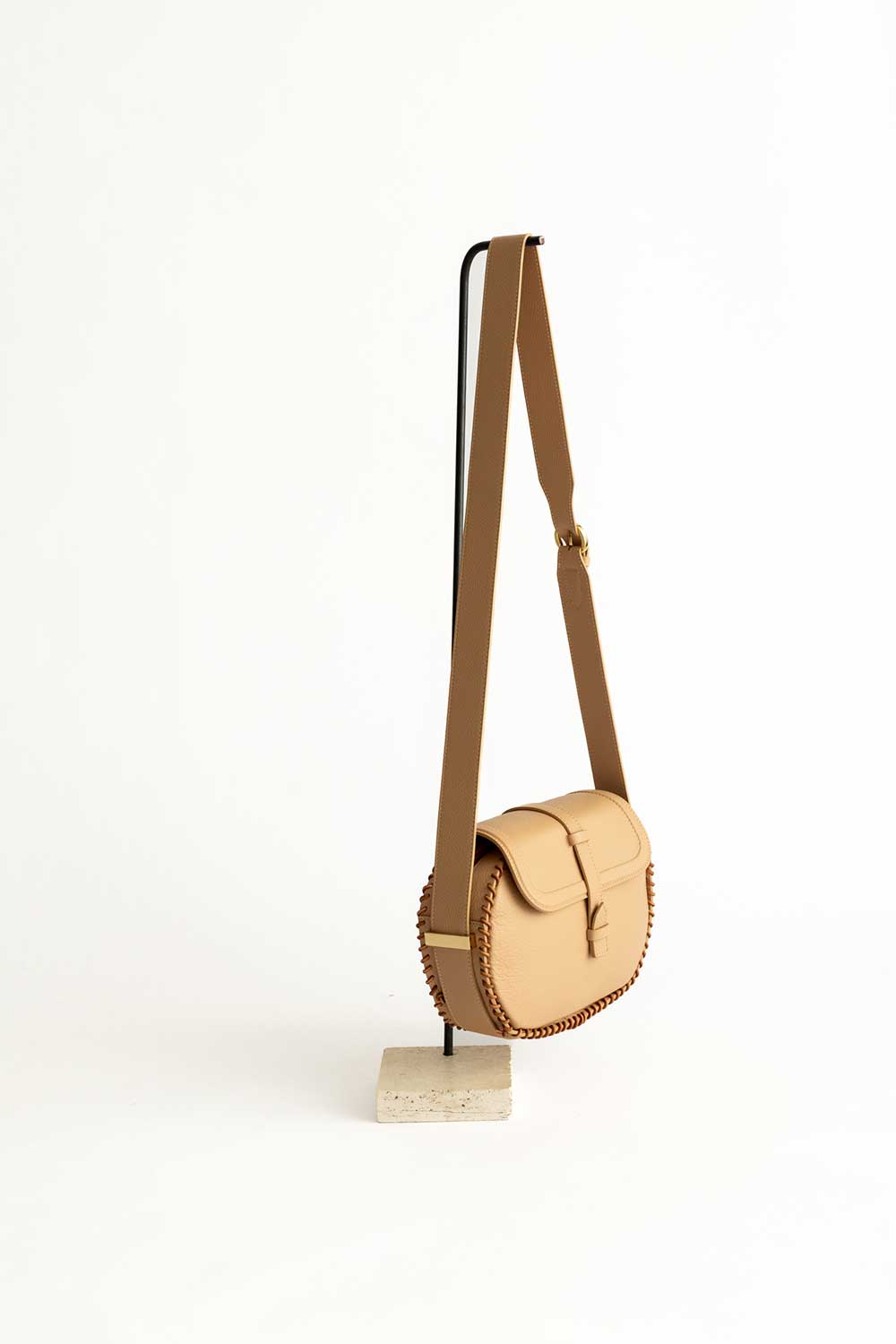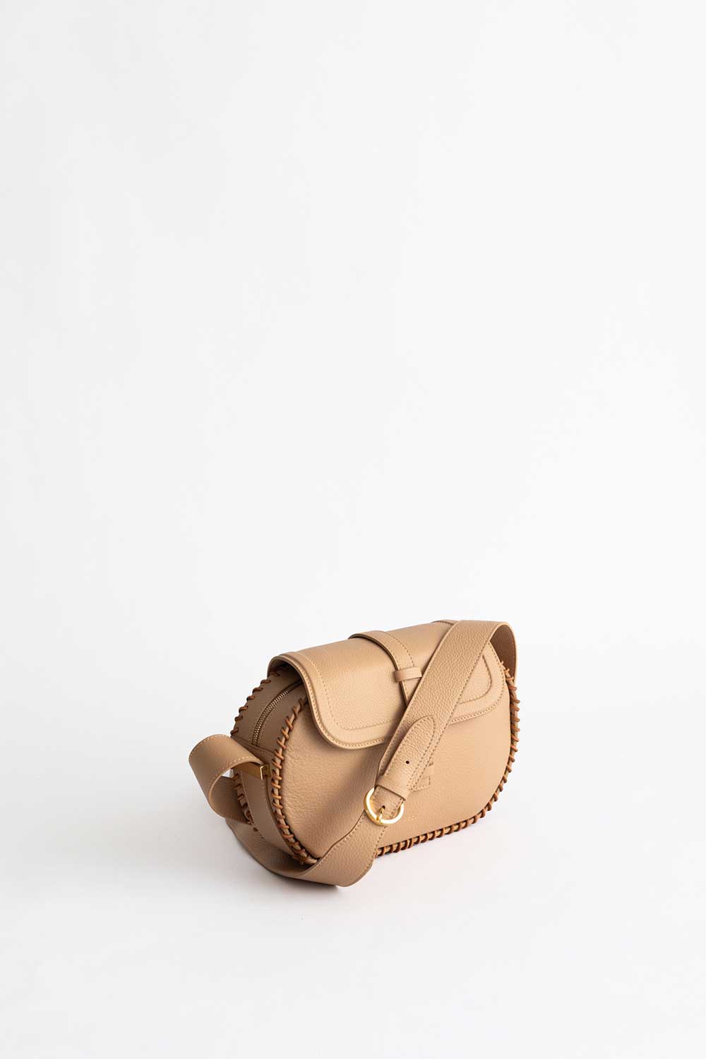 Shoulder bag in Sand leather with leather flap and Aztec weave with leather lace, shoulder strap made of cacao leather.