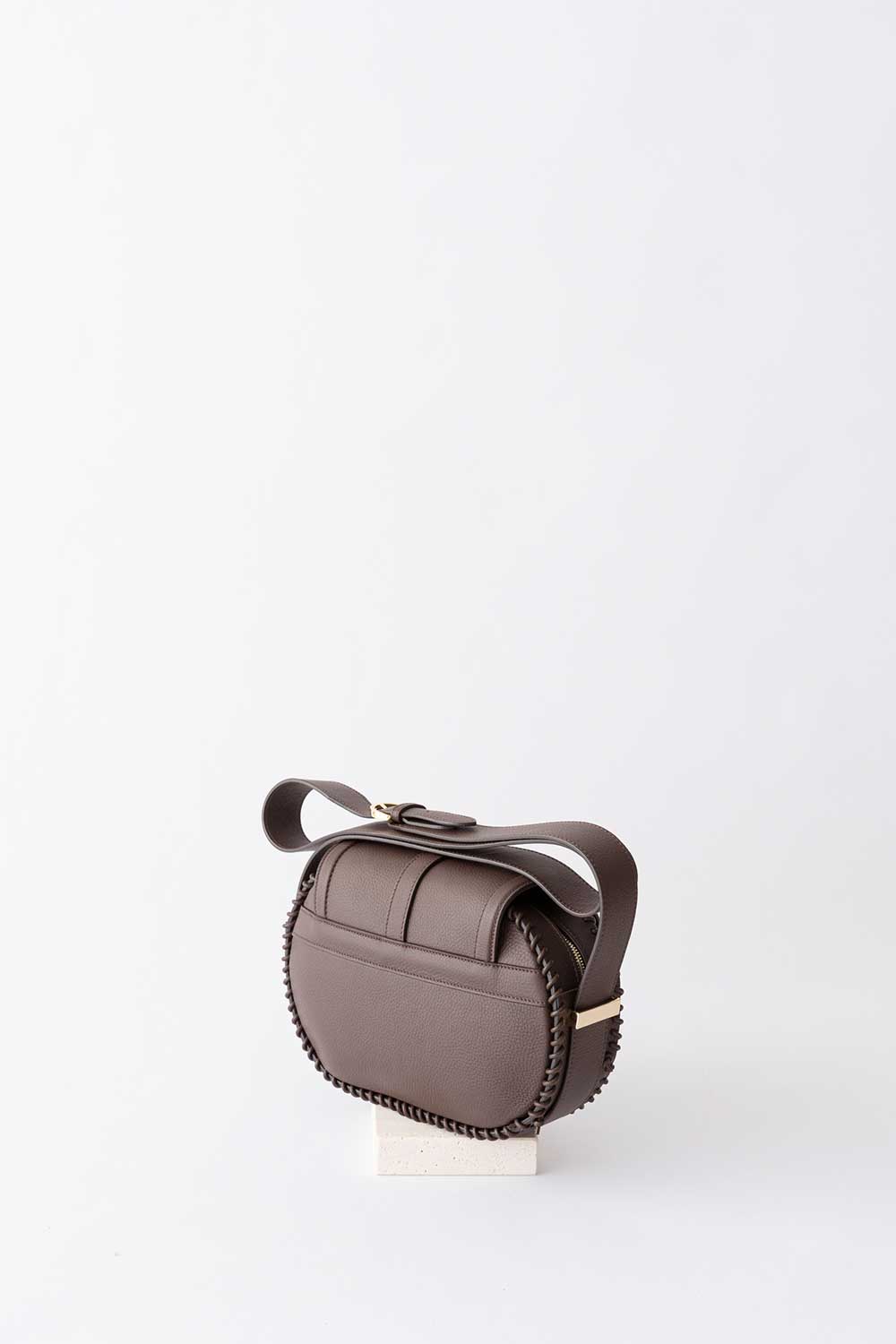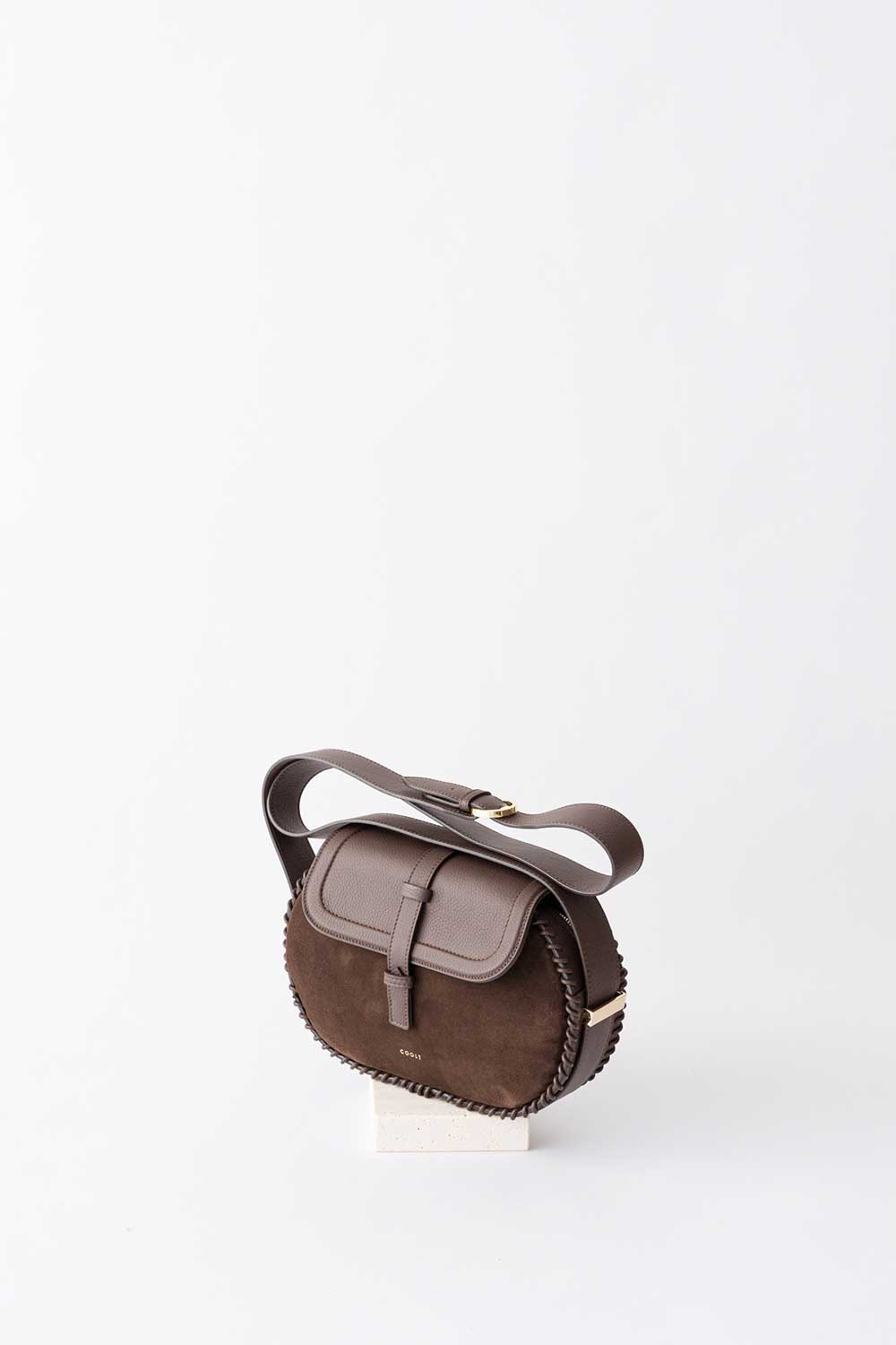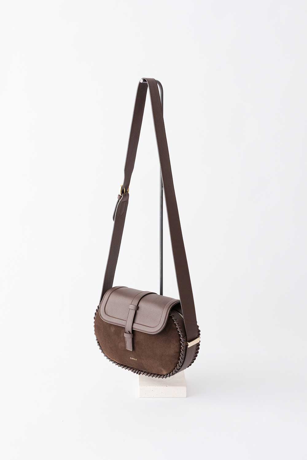 shoulder bag in suede testa di moro with leather flap in leather Testa Di Moro and Aztec weave with cacao leather lace, shoulder strap made of testa di moro leather.