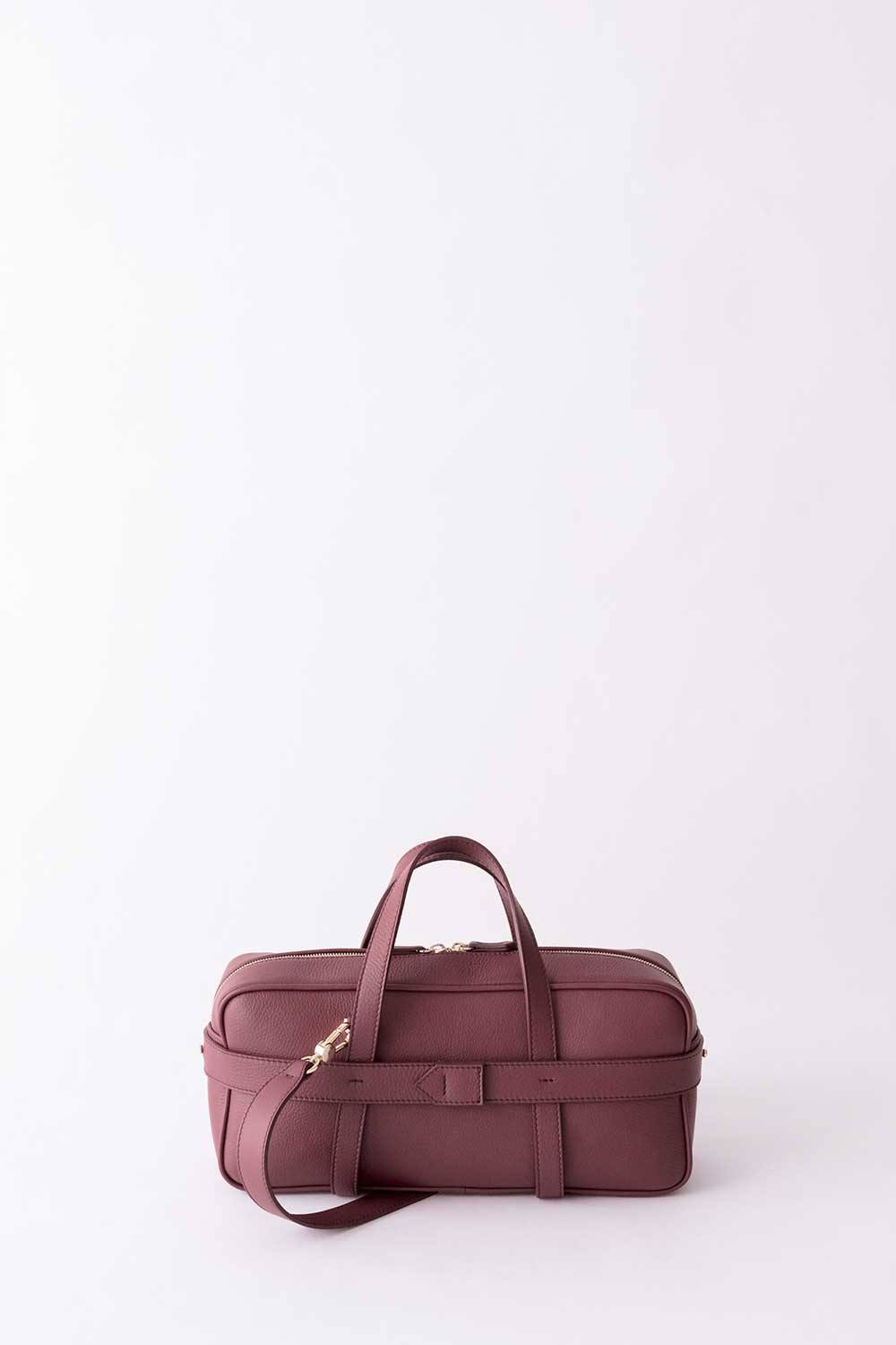 Rectangular shaped bag made of grained leather, removable leather cage of grained leather.