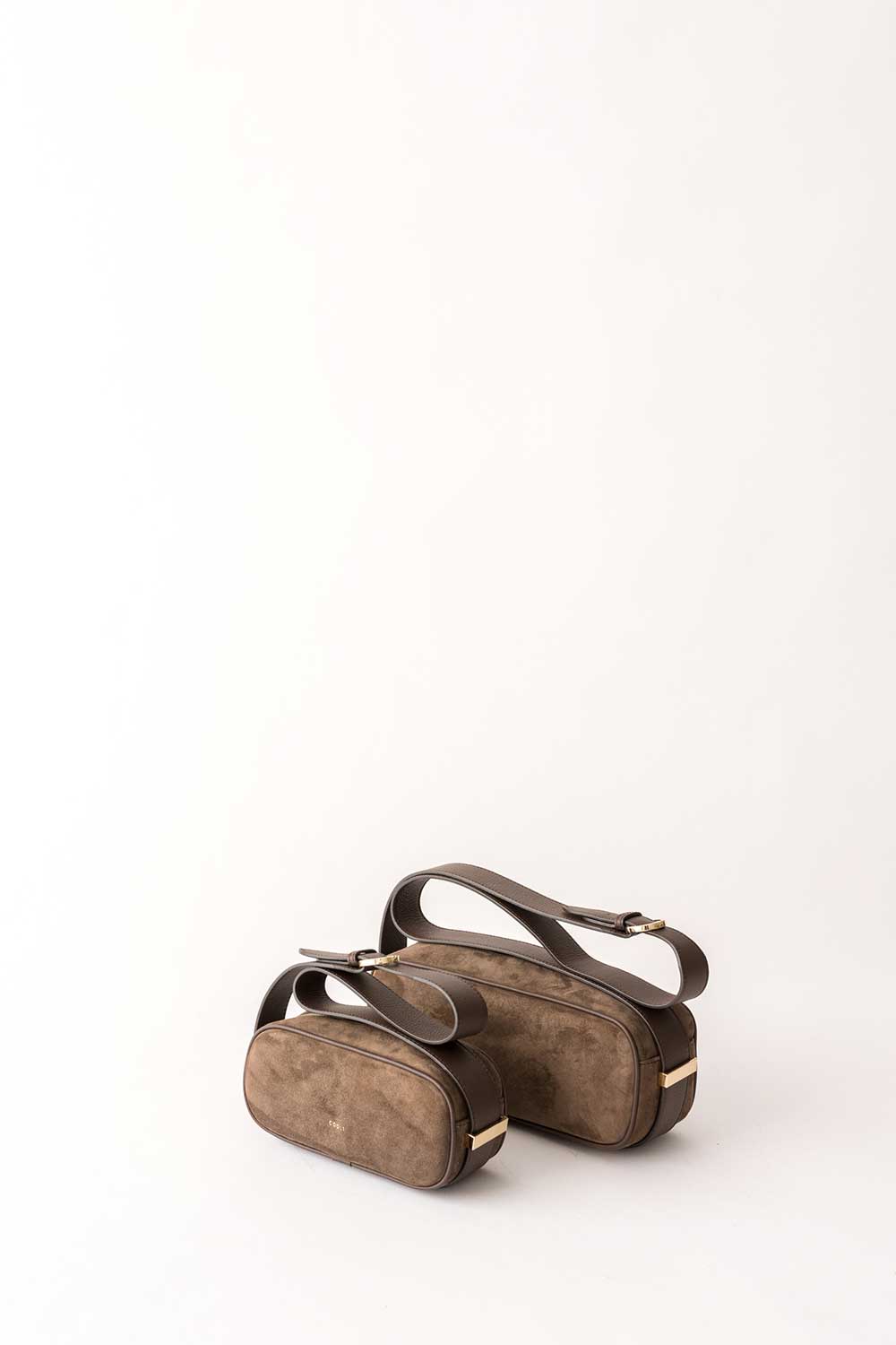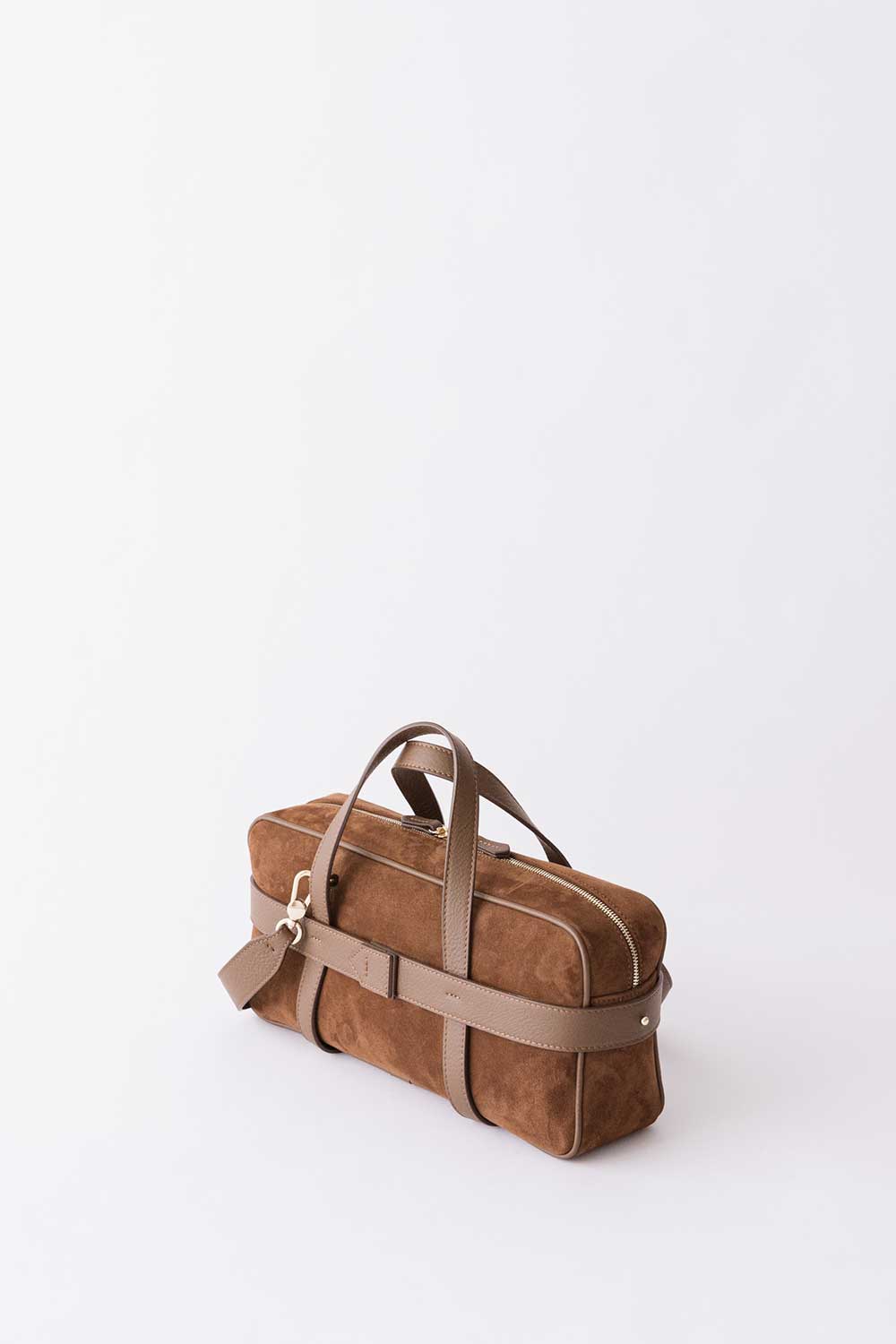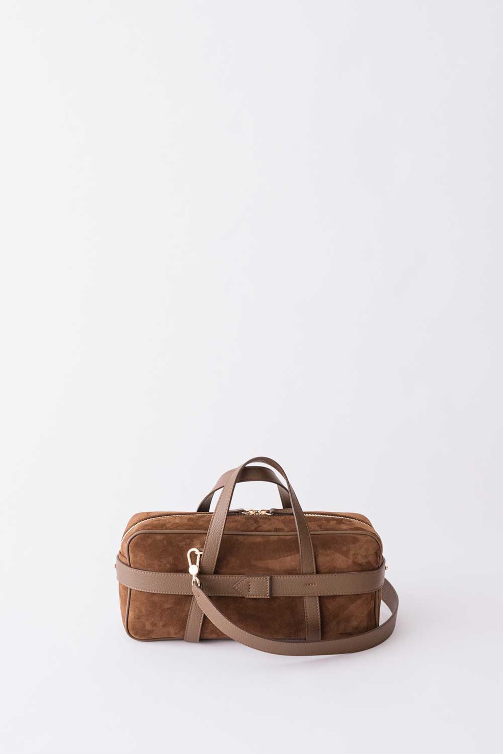 Rectangular shaped bag made of Castagna Suede leather, removable leather cage of Cacao grained leather. To carry for the top handles or the optional shoulder strap.