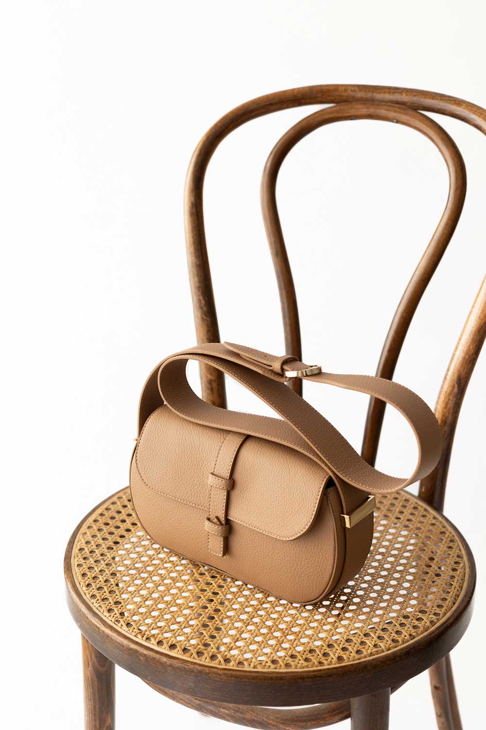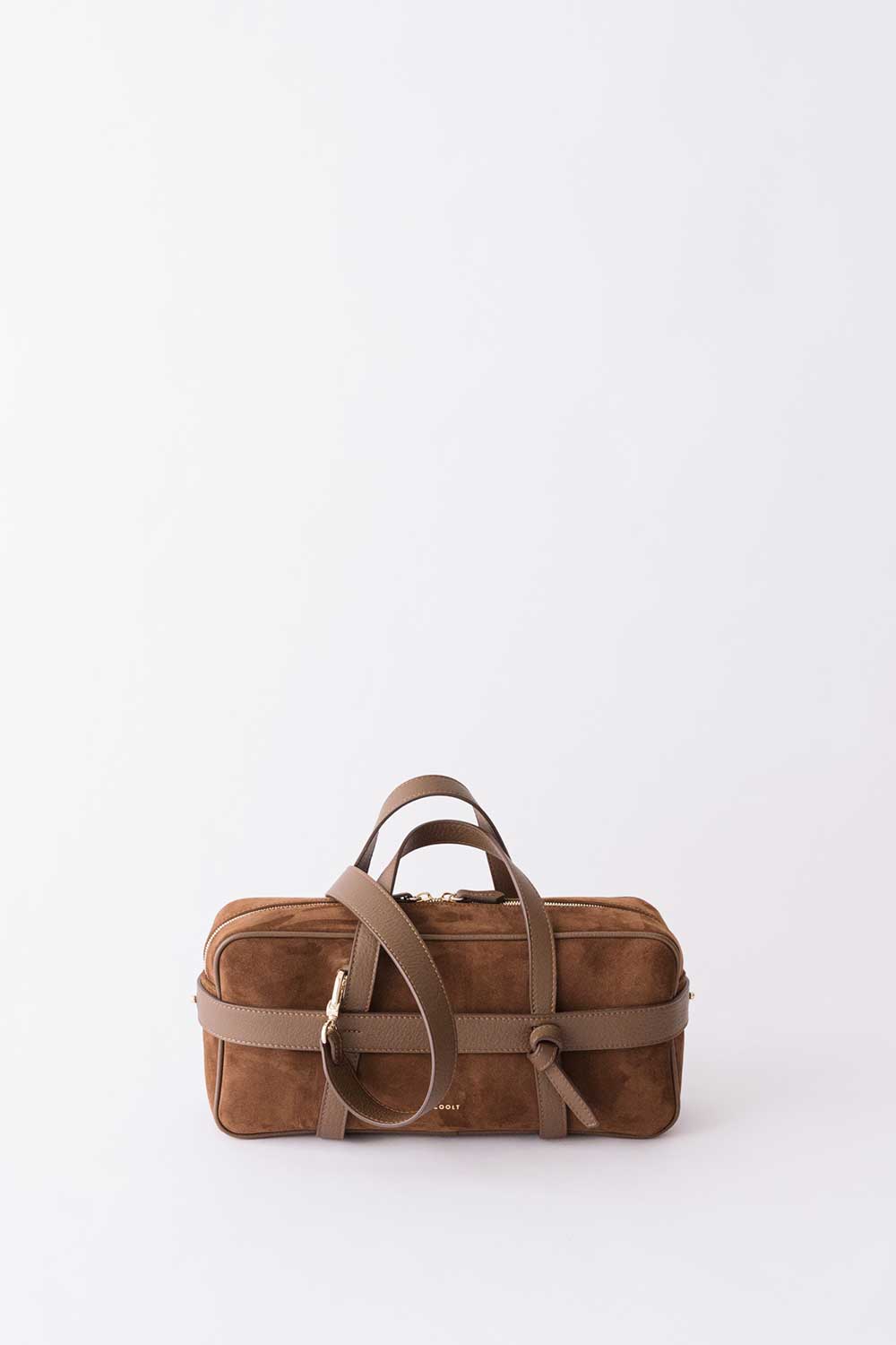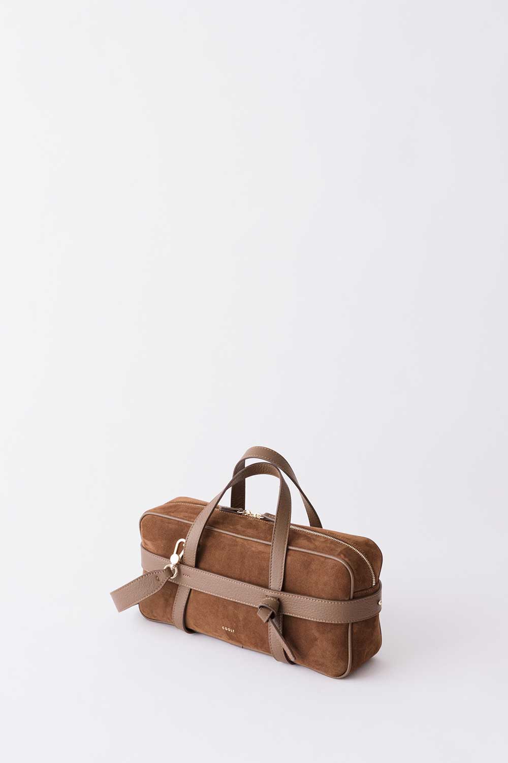 Rectangular shaped bag made of Castagna Suede leather, removable leather cage of Cacao grained leather. To carry for the top handles or the optional shoulder strap.