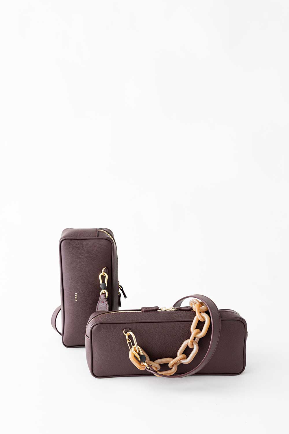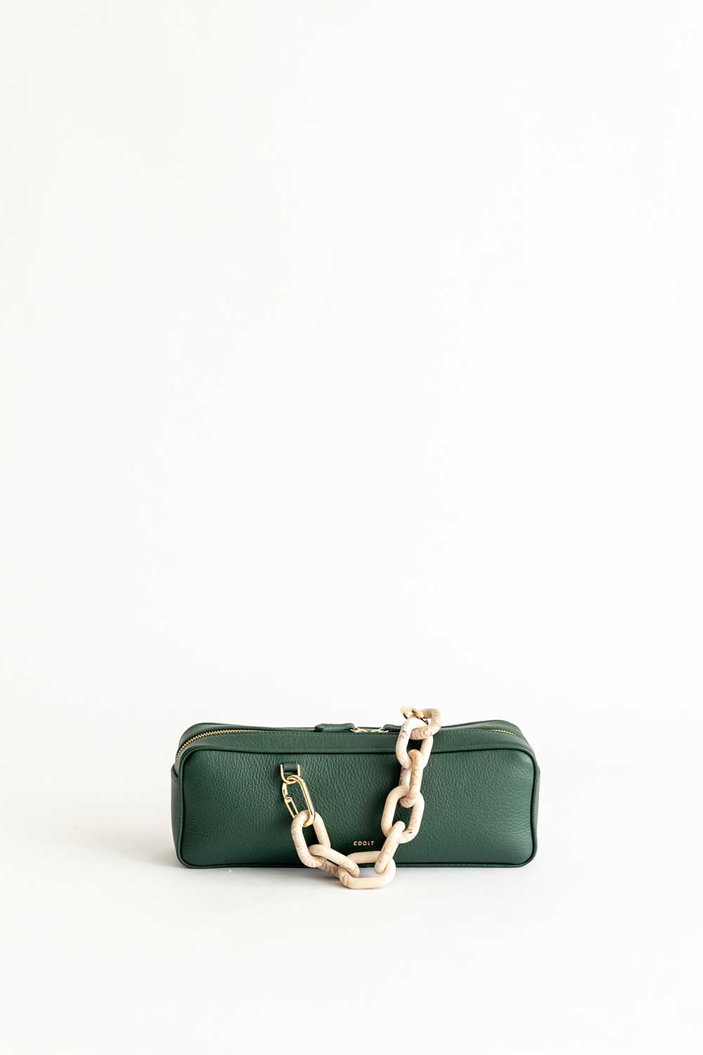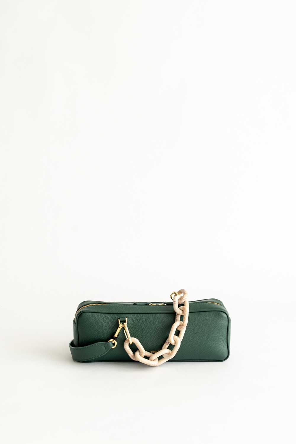 Rectangular shaped bag made of bosco Leather. Leather shoulder strap and handle in resin Chain.