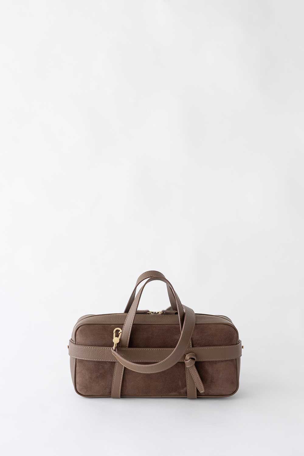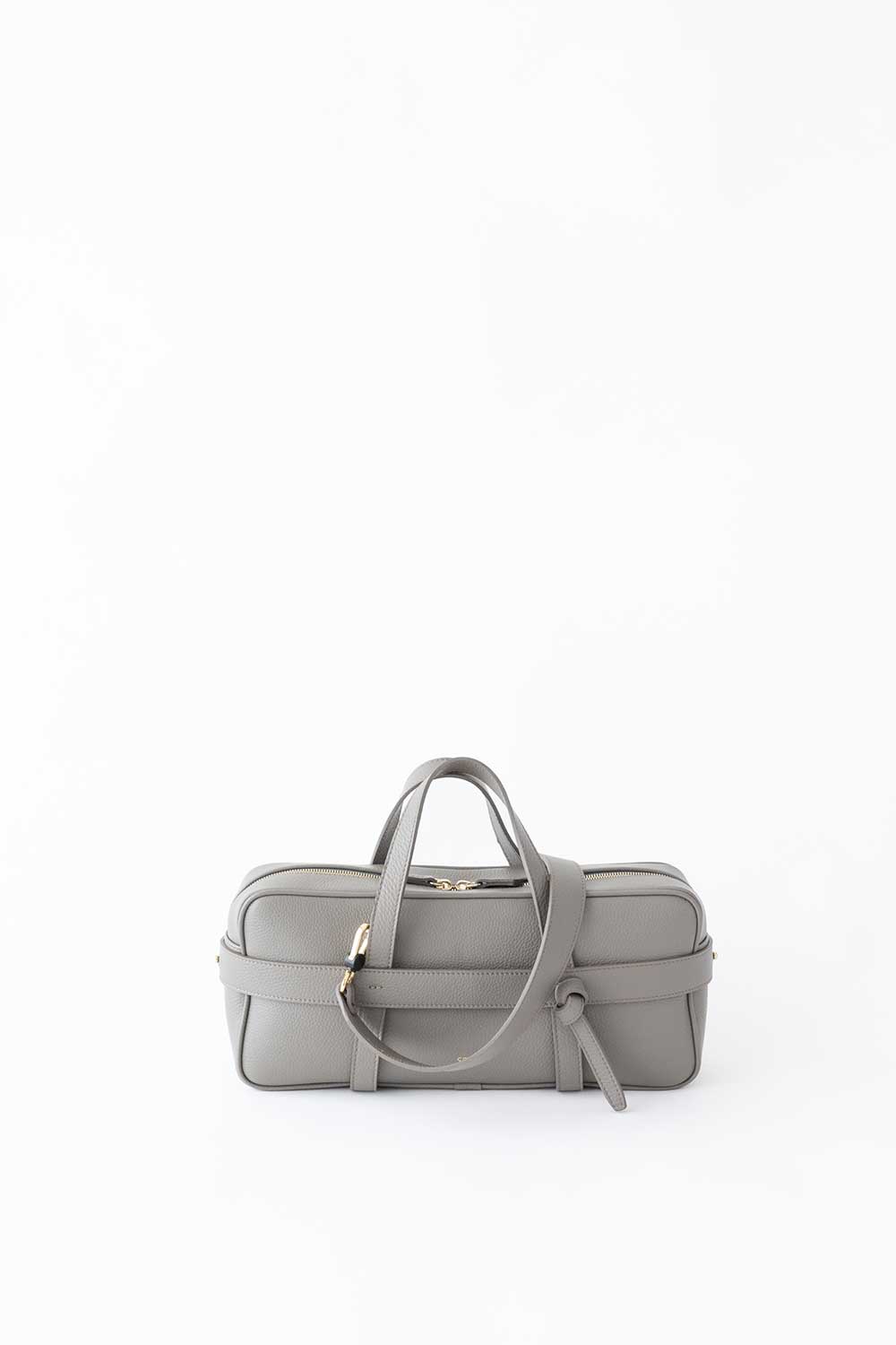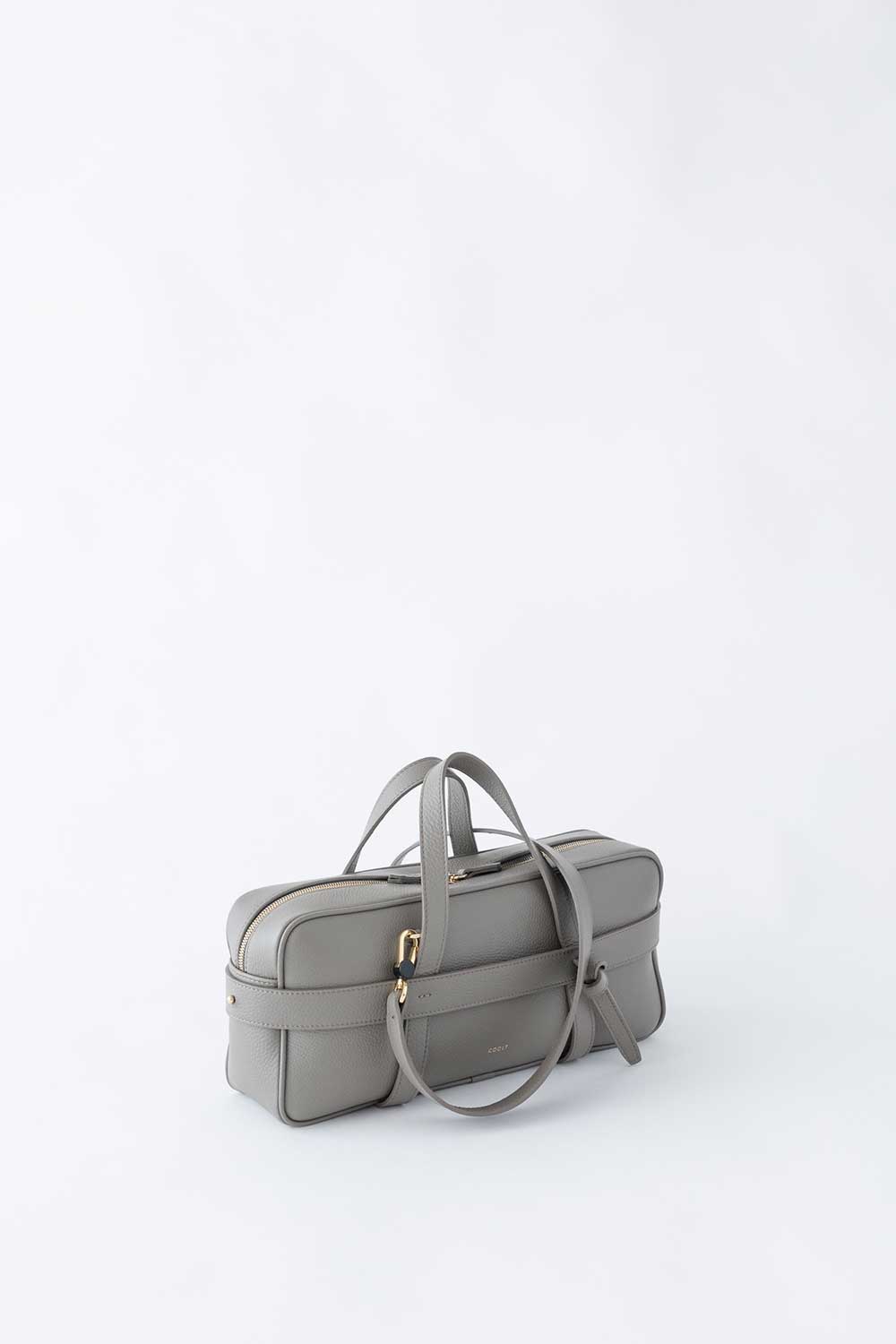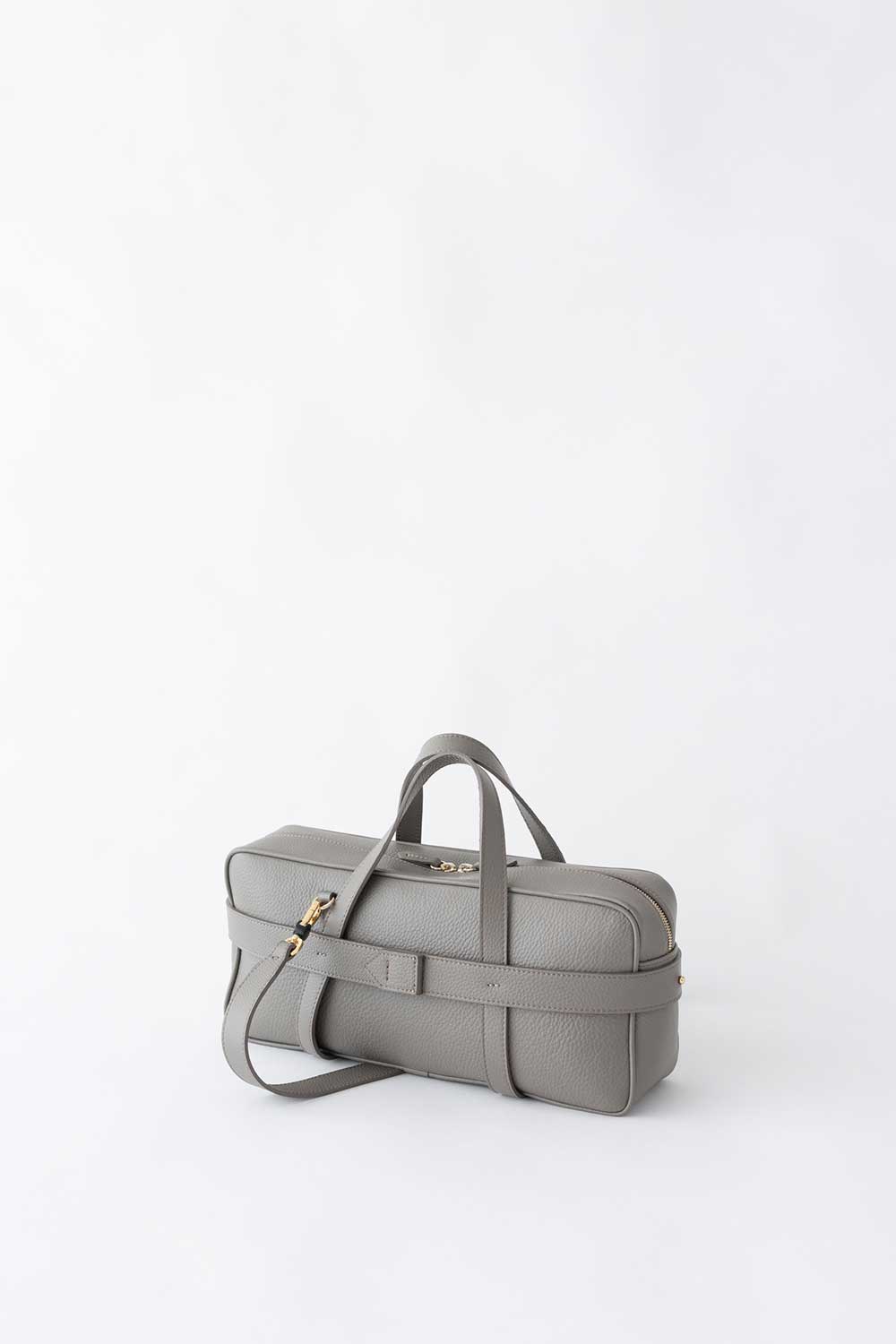 Rectangular shaped bag made of grey grained leather, removable leather cage of gray grained leather. To carry for the top handles or the optional shoulder strap.