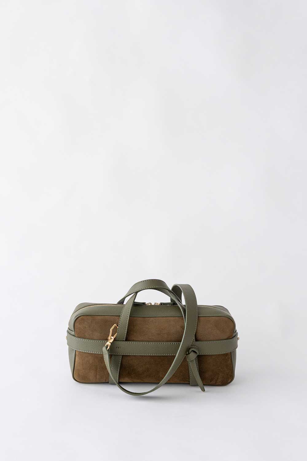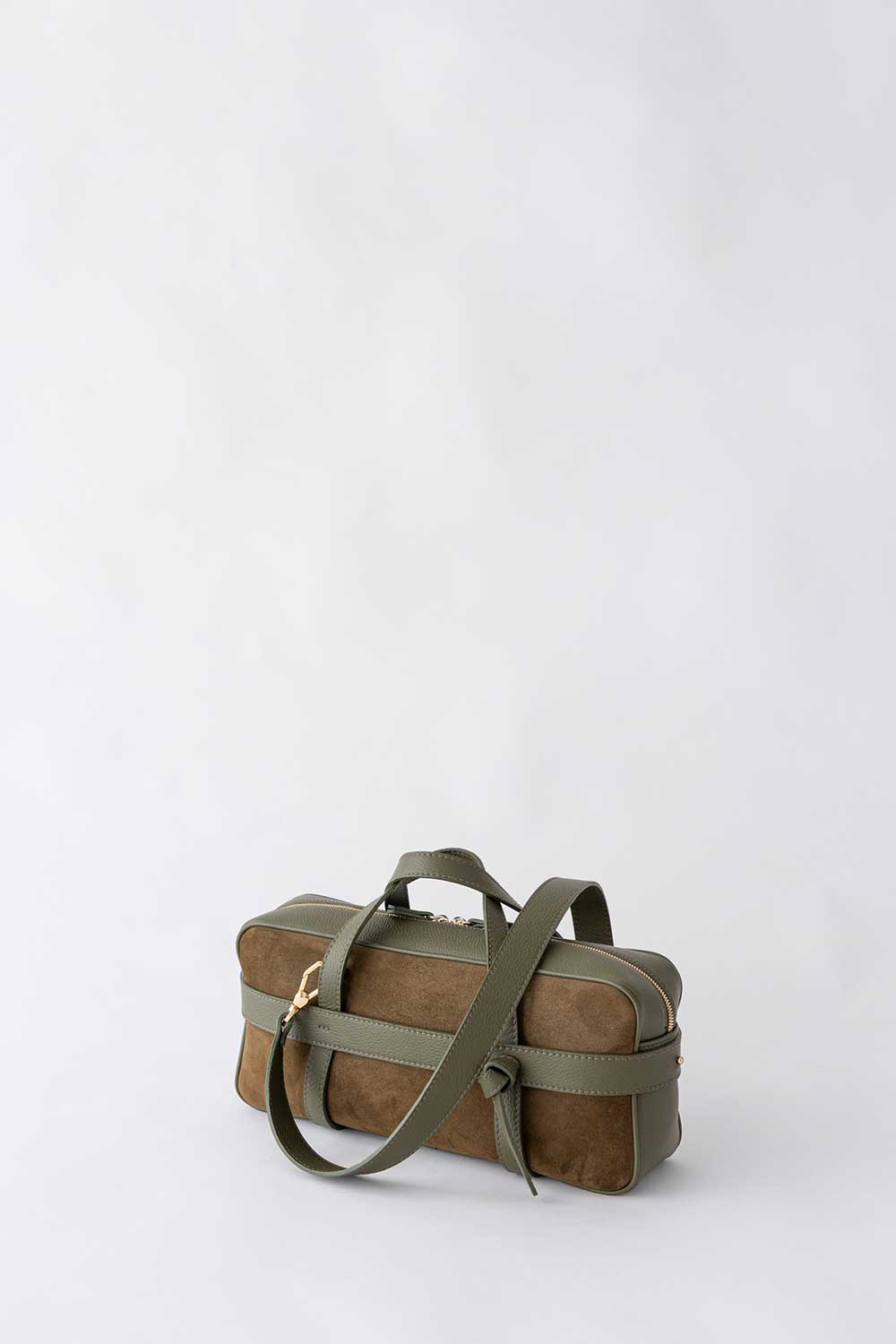 Rectangular shaped bag made of Olive grained leather and suede, removable leather cage of olive grained leather .