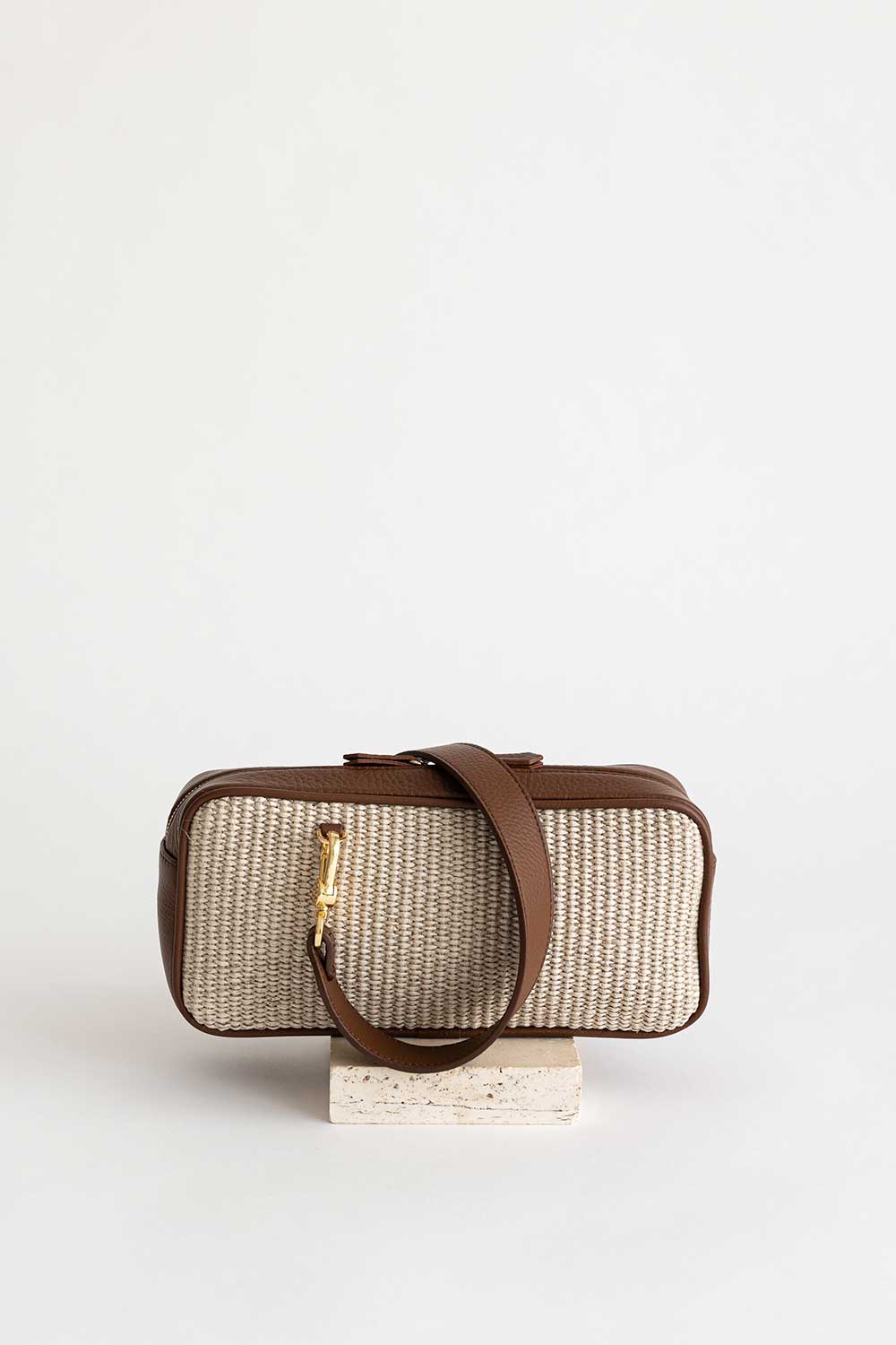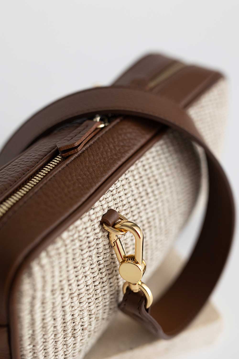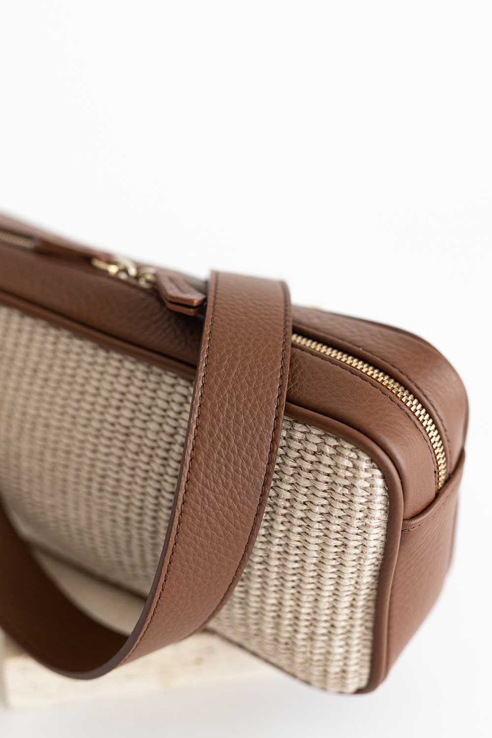 Rectangular shaped bag made of Cacao grained leather and raffia natural.