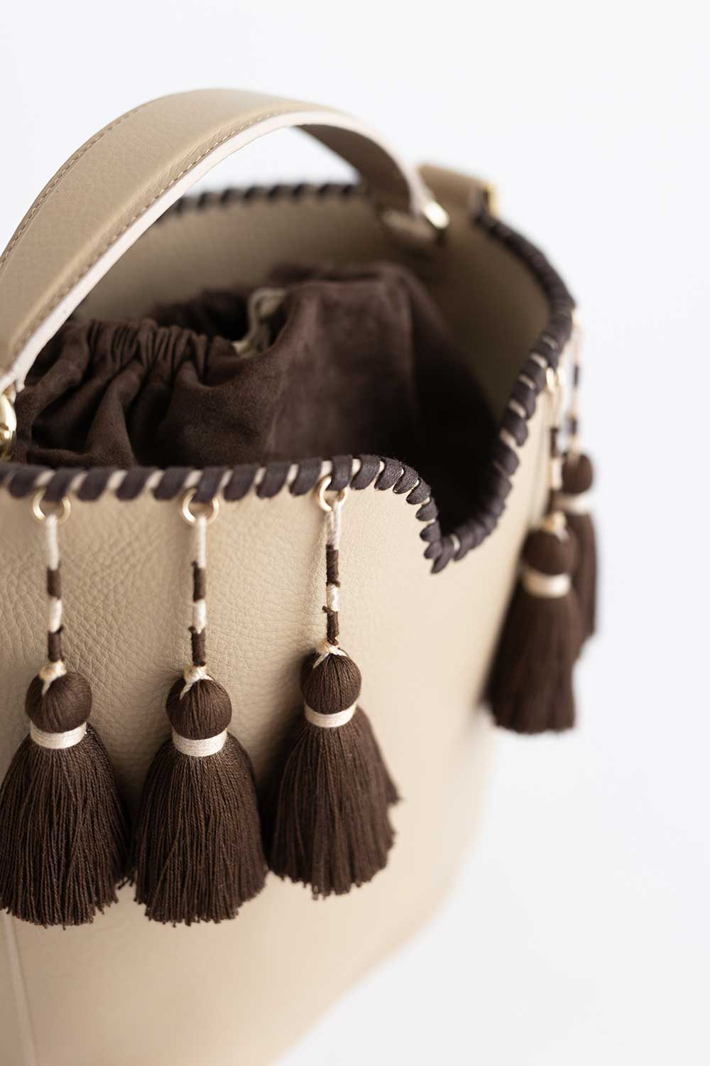 suede lining in cacao That can be pulled up to keep belongings secure.