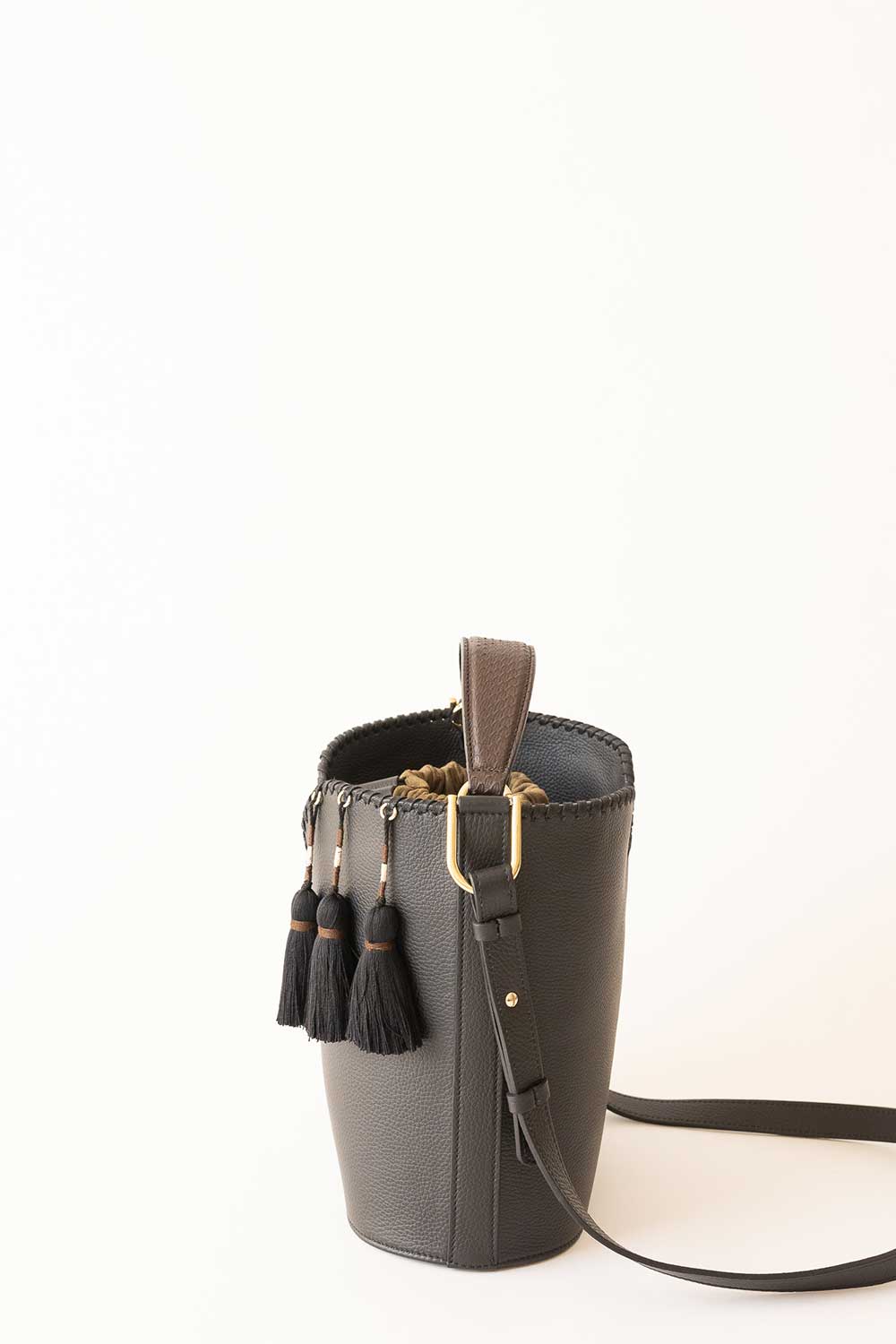 Sackville Bucket bag is a both elegant and ample enough for everyday essentials. The Upper curves are enhanced by the cacao cotton lace.